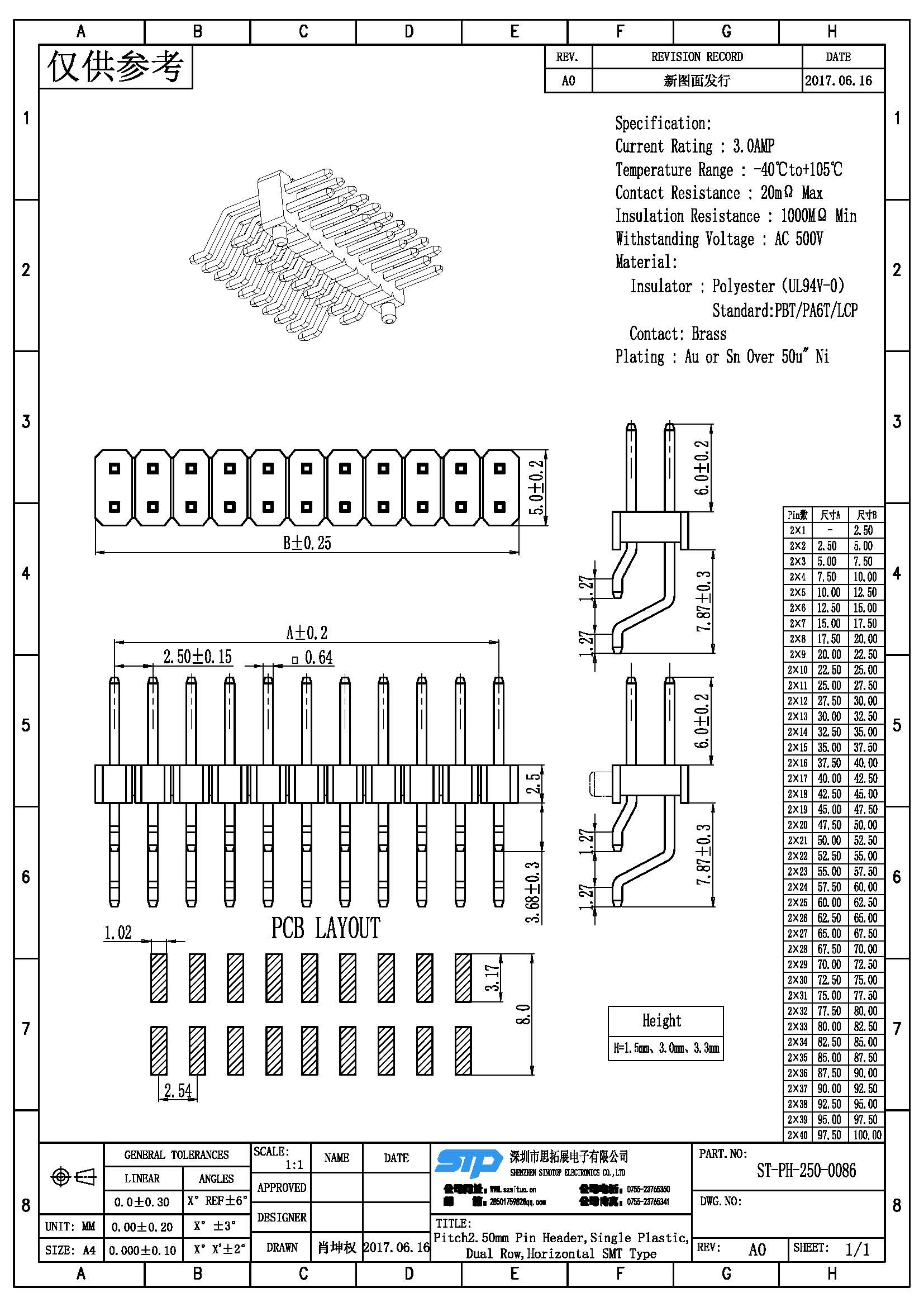 - 产品规格:2.50MM双排针,单塑,卧贴