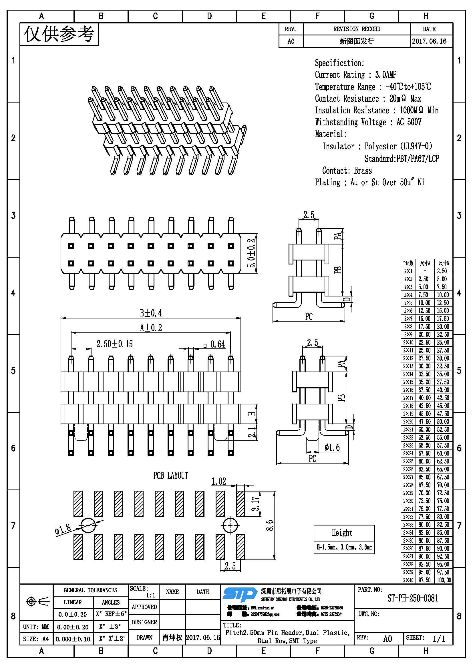 Spec:Pitch2.50mm Pin Header,Dual Plastic,Dual Row,SMT Type
