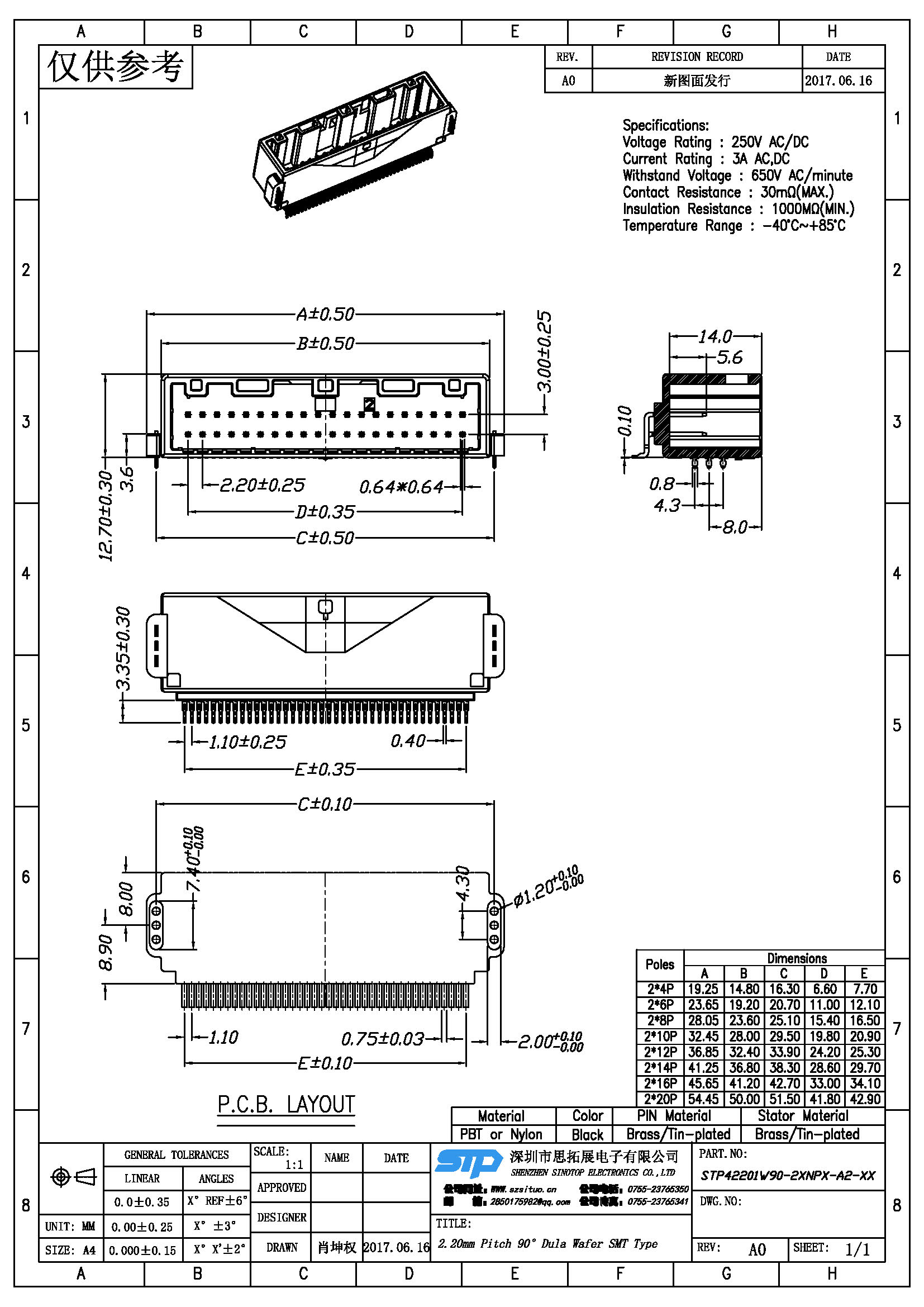 - 产品规格:2.20MM针座,双排贴片,卧式