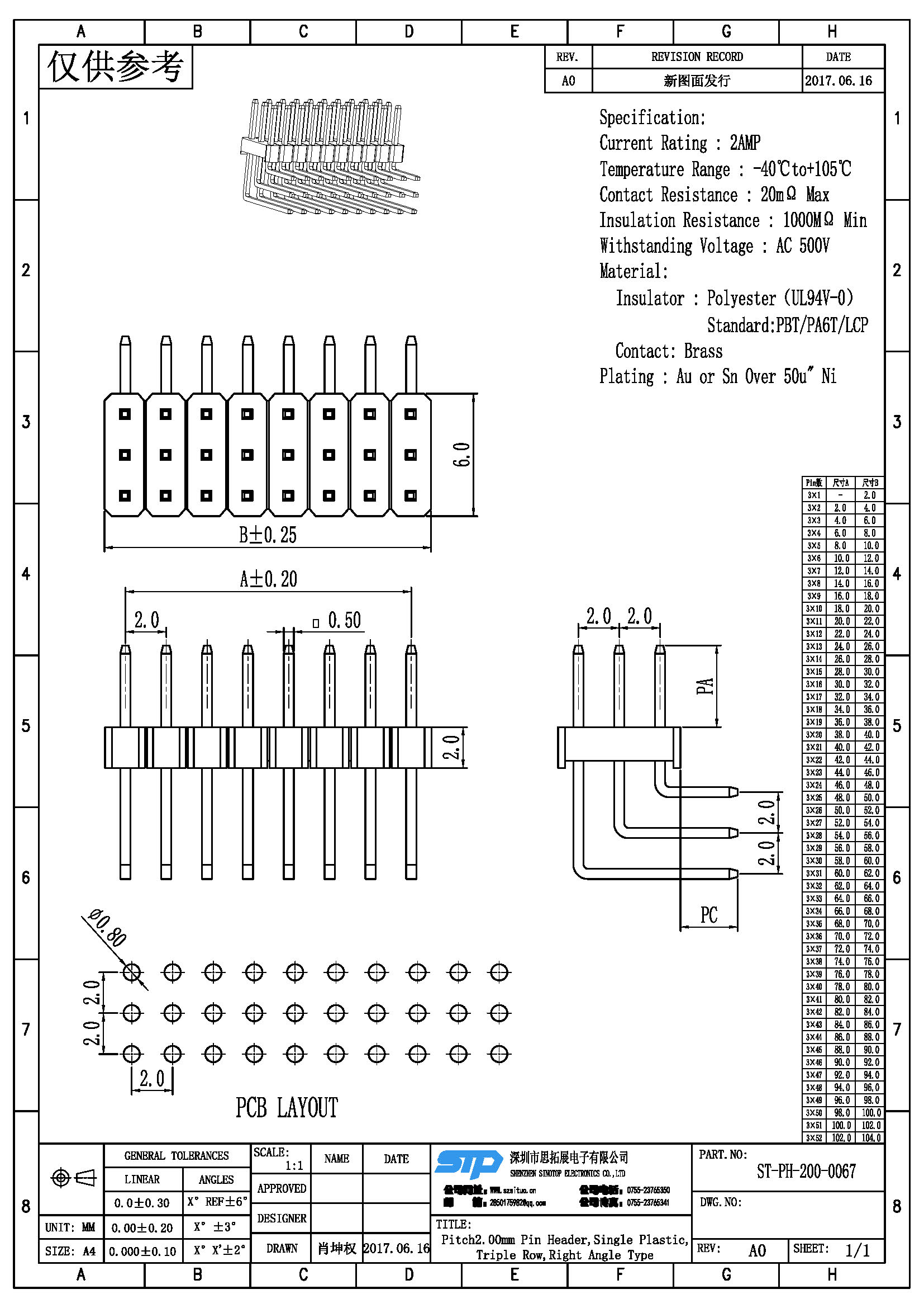 Spec:Pitch2.00MM Pin Header,Triple Row, Single Plastic, Right Angle Type