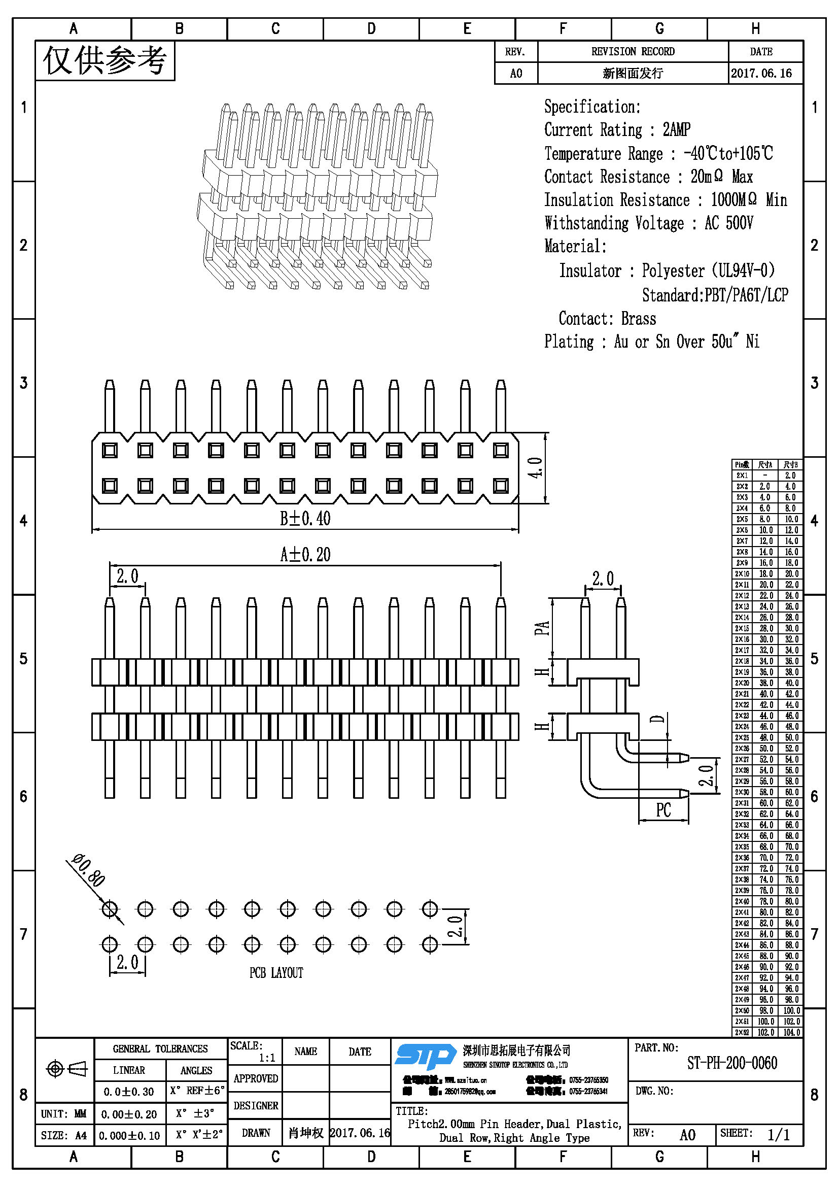 Spec:Pitch2.00MM Pin Header,Dual Row, Dual Plastic, Right Angle Type