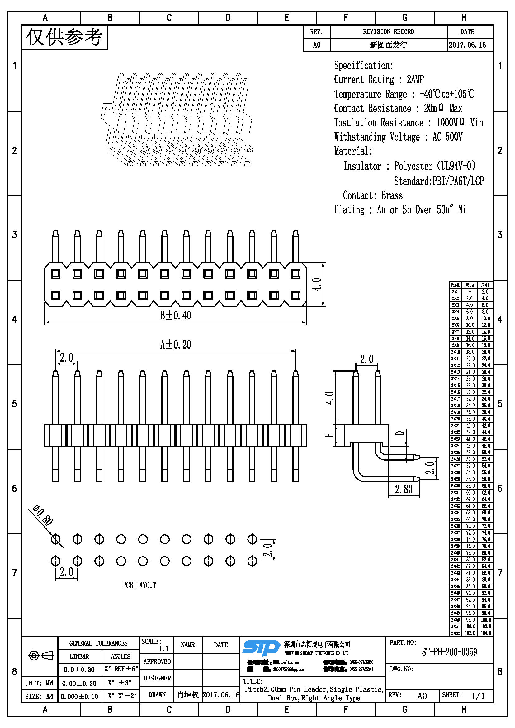 Spec:Pitch2.00MM Pin Header,Dual Row, Single Plastic, Right Angle Type