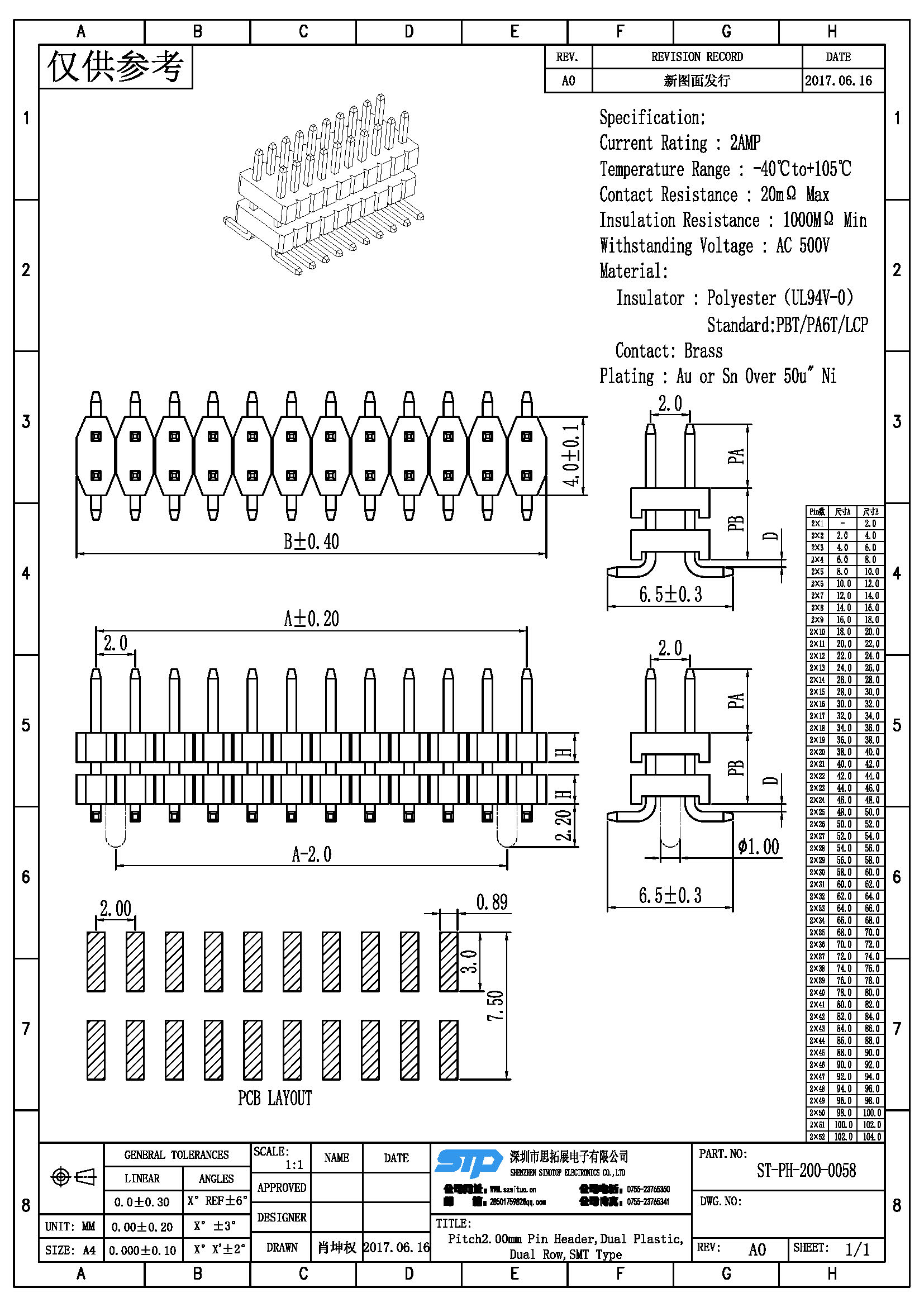 Spec:Pitch2.00MM Pin Header,Dual Row, Dual Plastic, SMT Type