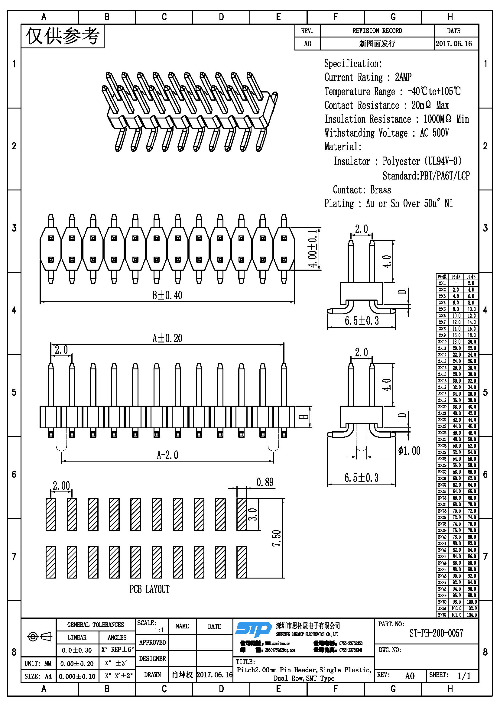 Spec:Pitch2.00MM Pin Header,Dual Row, Single Plastic, SMT Type