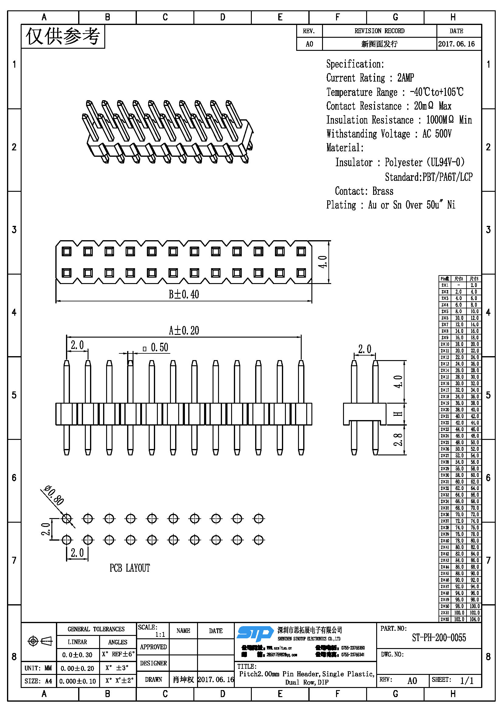 Spec:Pitch2.00MM Pin Header,Dual Row, Single Plastic, DIP Type
