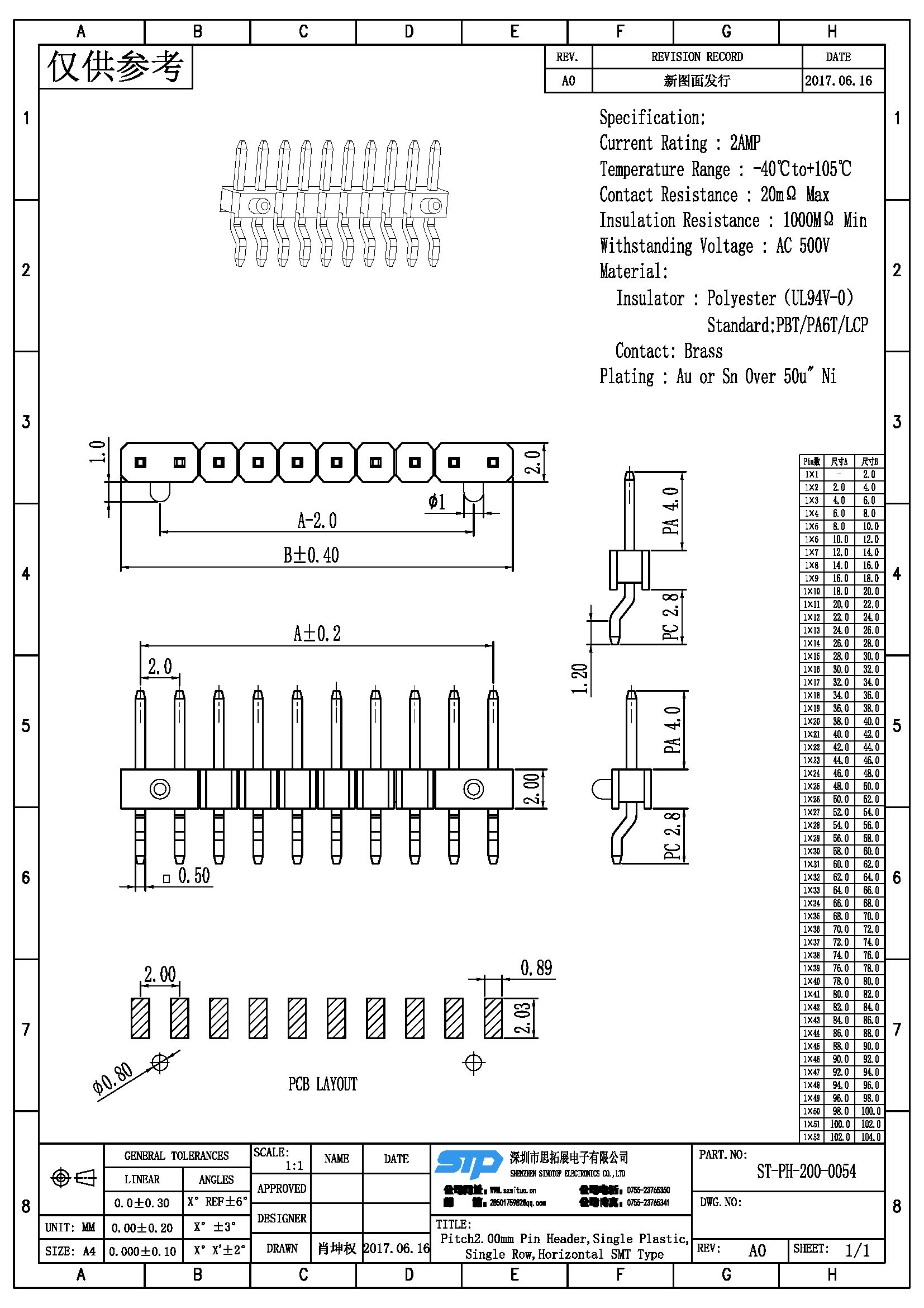 - 产品规格:2.0MM单排针,单塑,卧贴