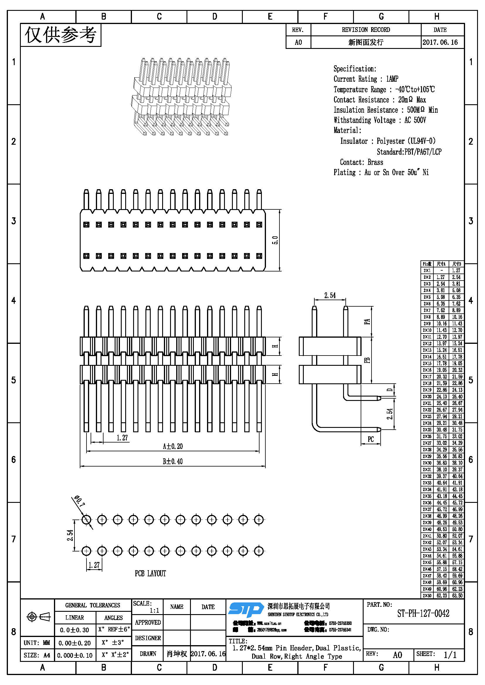- 产品规格:1.27*2.54MM双排针,多塑,90度