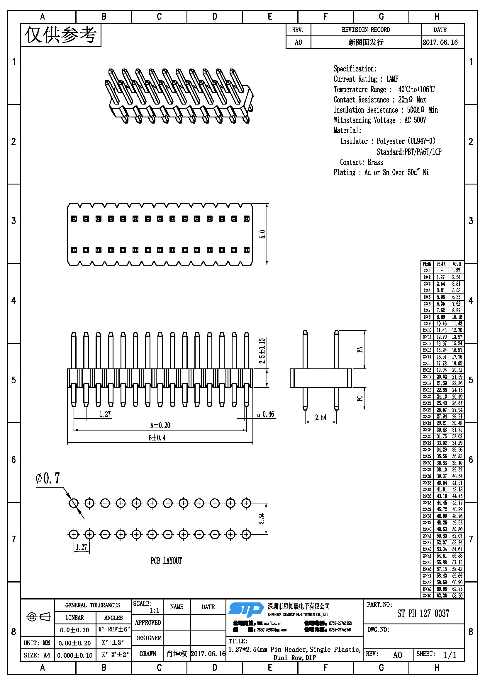 规格型号:Pitch1.27*2.54MM,双排针,单塑, DIP