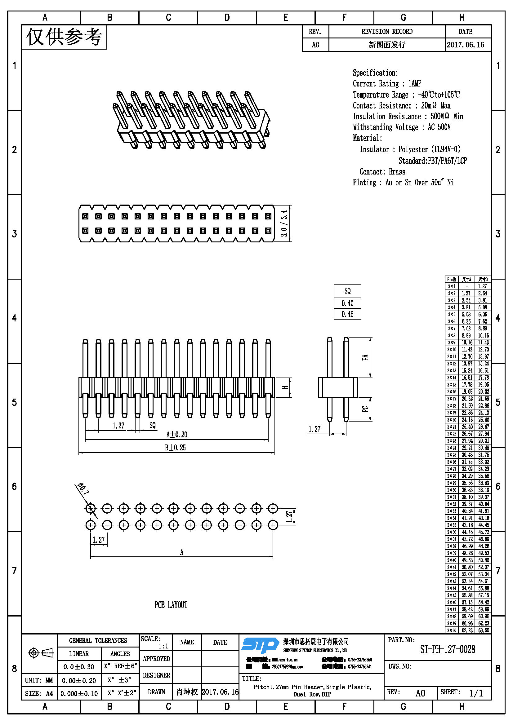 规格型号:Pitch1.27MM,双排针,单塑, DIP