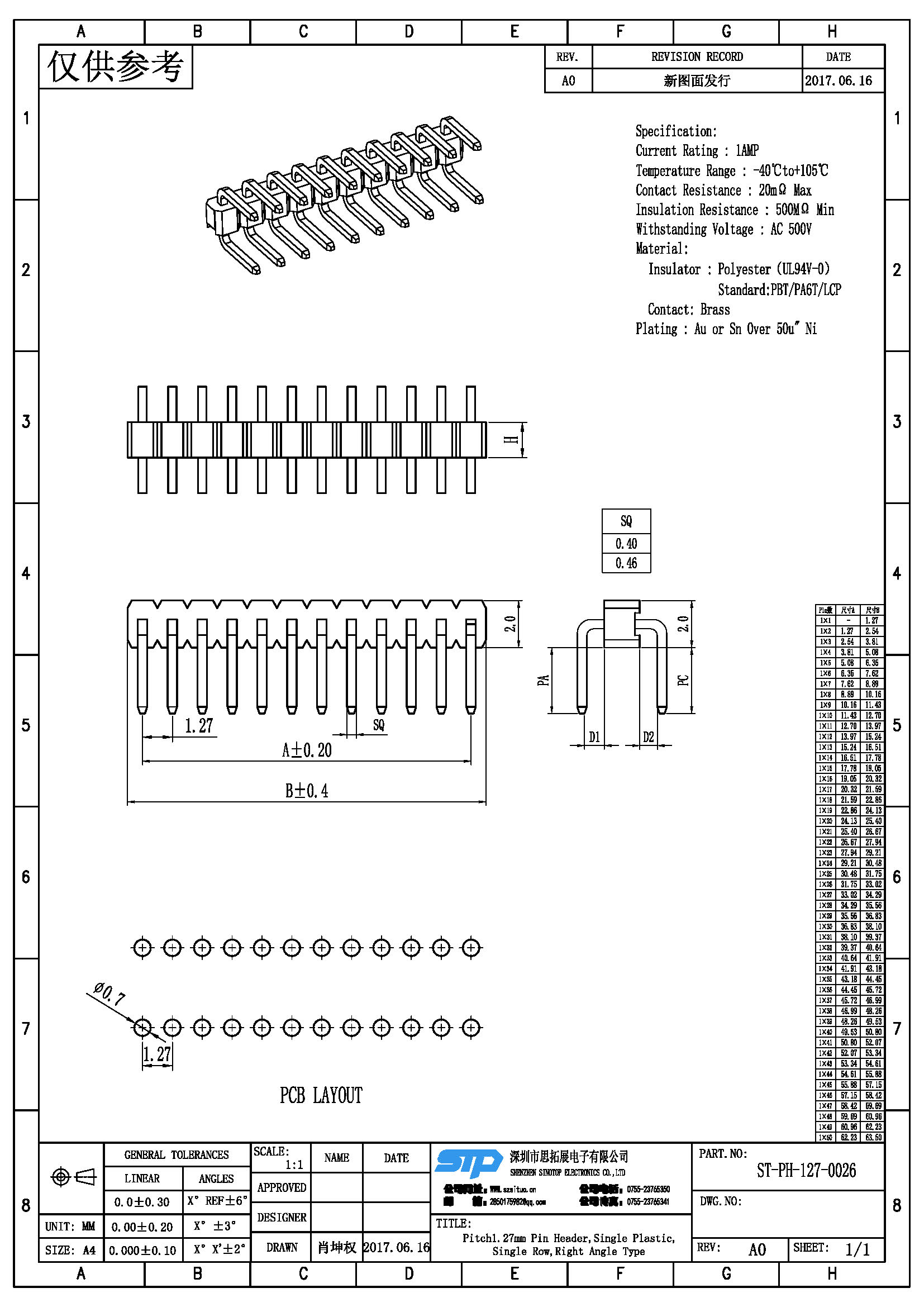 Spec:Pitch1.27MM Pin Header,Single Row, Single Plastic, Right Angle Type
