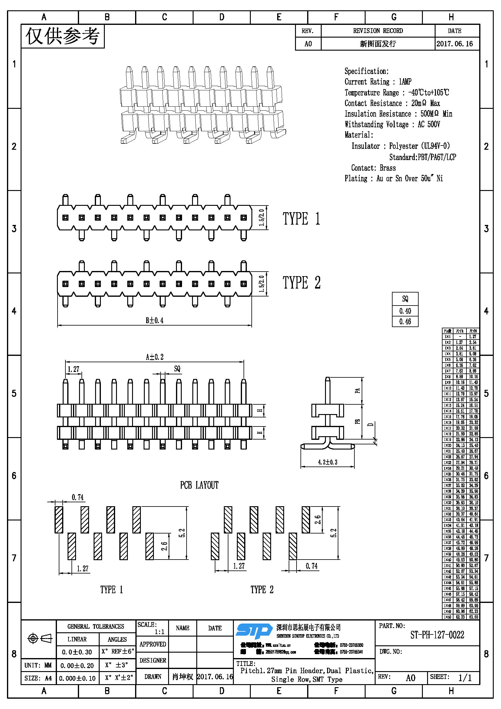 Spec:Pitch1.27MM Pin Header,Single Row, Dual Plastic, SMT Type