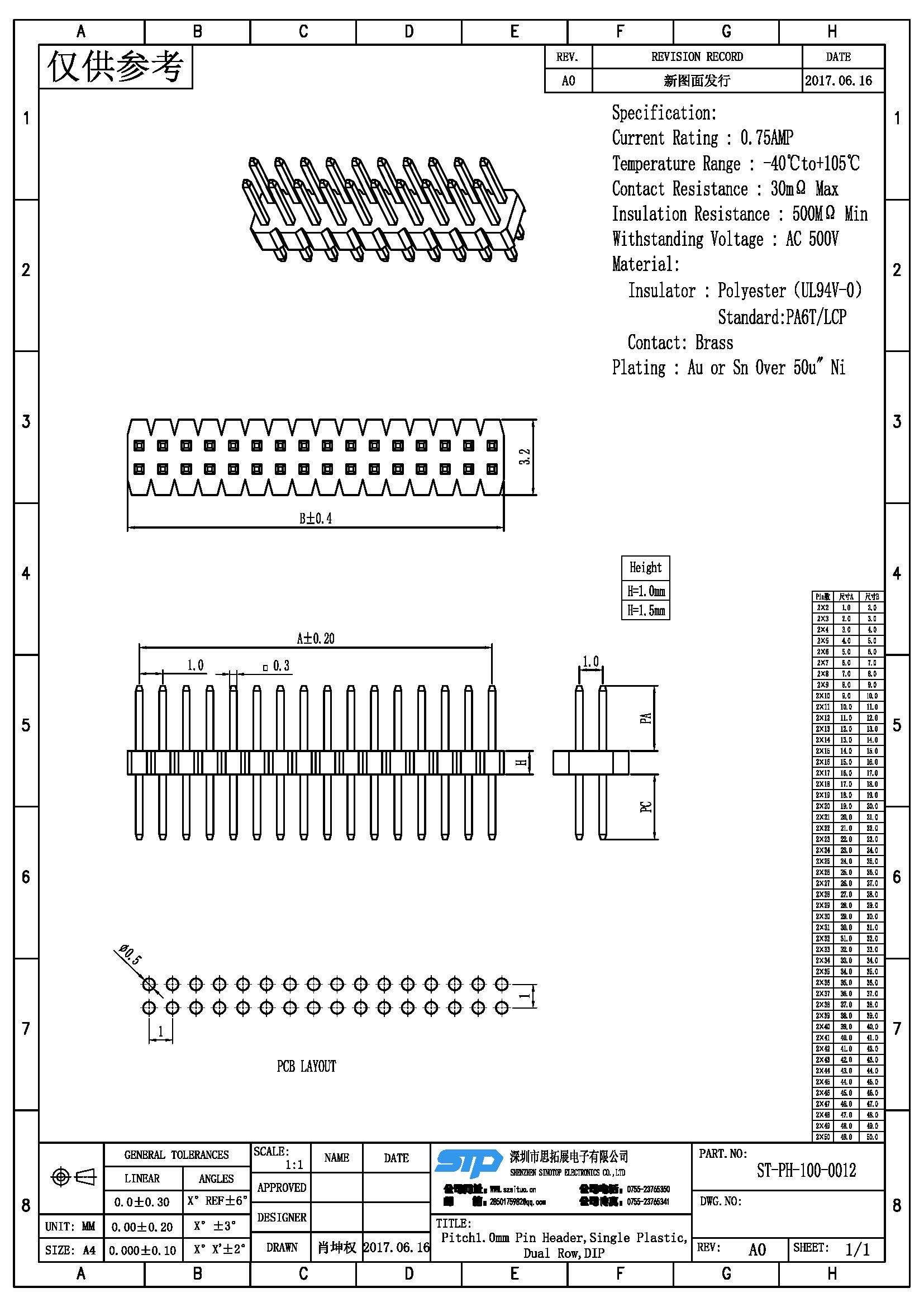 规格型号:Pitch1.00MM,双排针,单塑, DIP