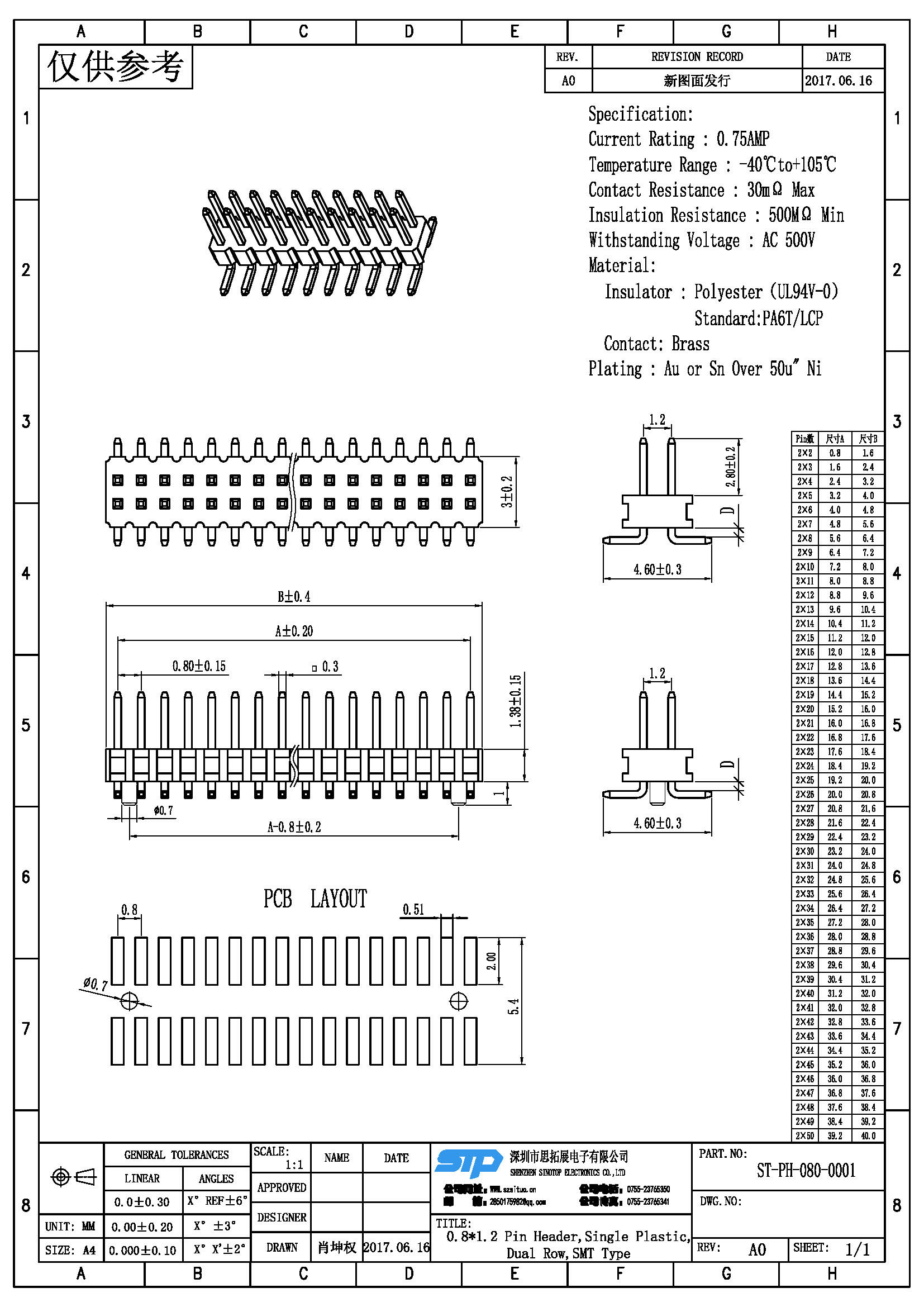 - 产品规格:0.8*1.2MM双排针,单塑,SMT