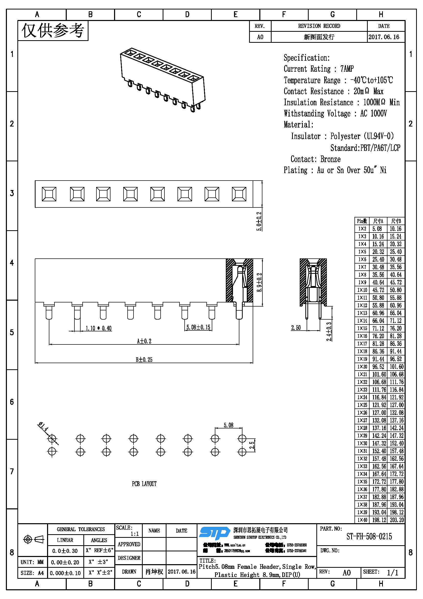 Spec:Pitch5.08MM Female Header,Single Row,DIP Type (U)