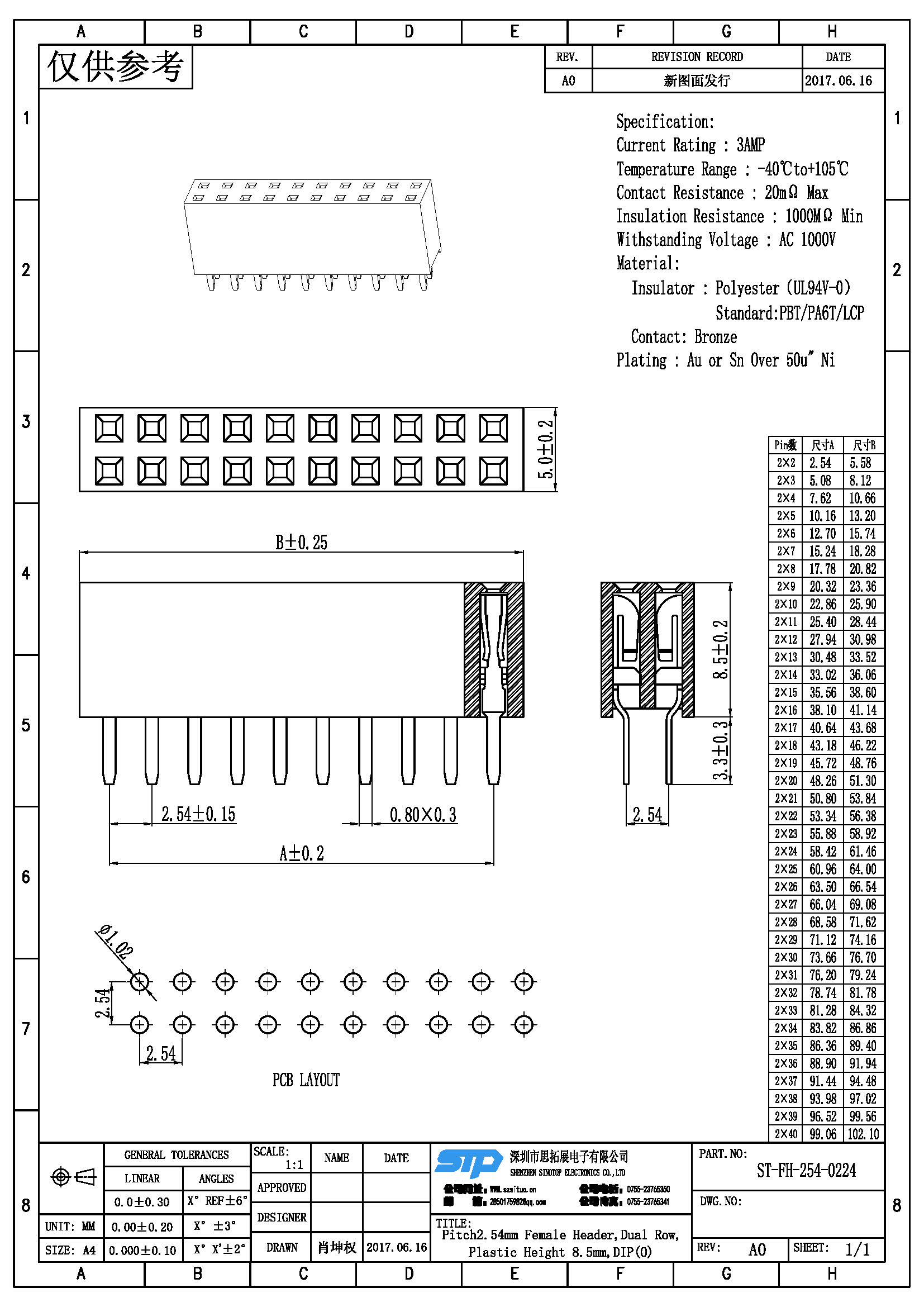 规格型号:Pitch2.54MM,双排母,DIP O端防锡