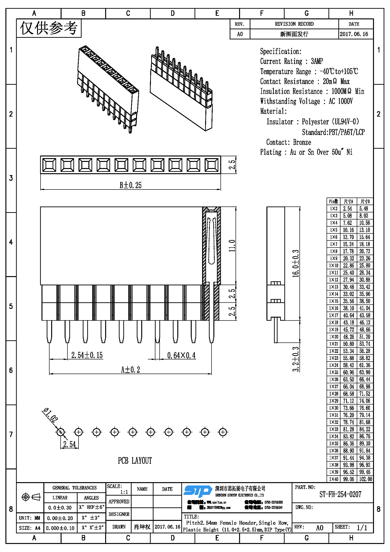 规格型号:Pitch2.54MM,单排母,DIP加高 Y端