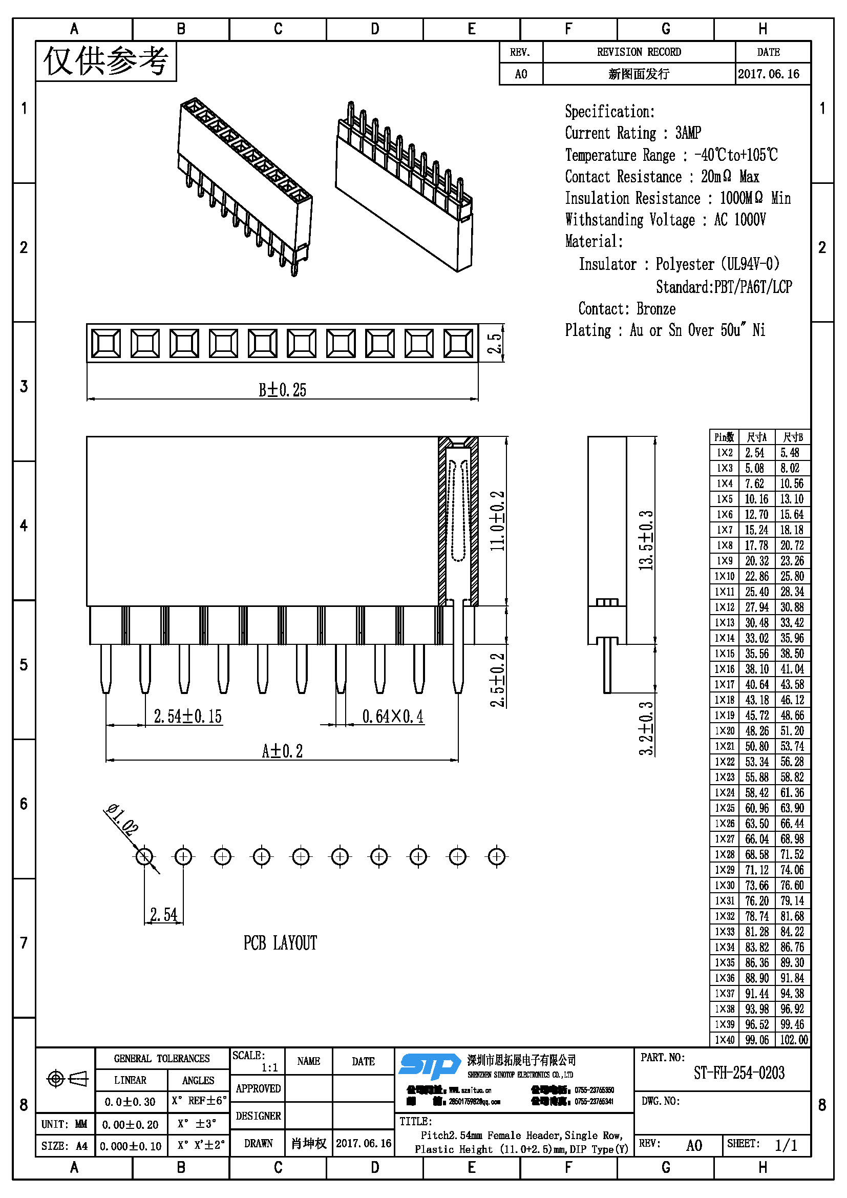 规格型号:Pitch2.54MM,单排母,DIP加高 Y端