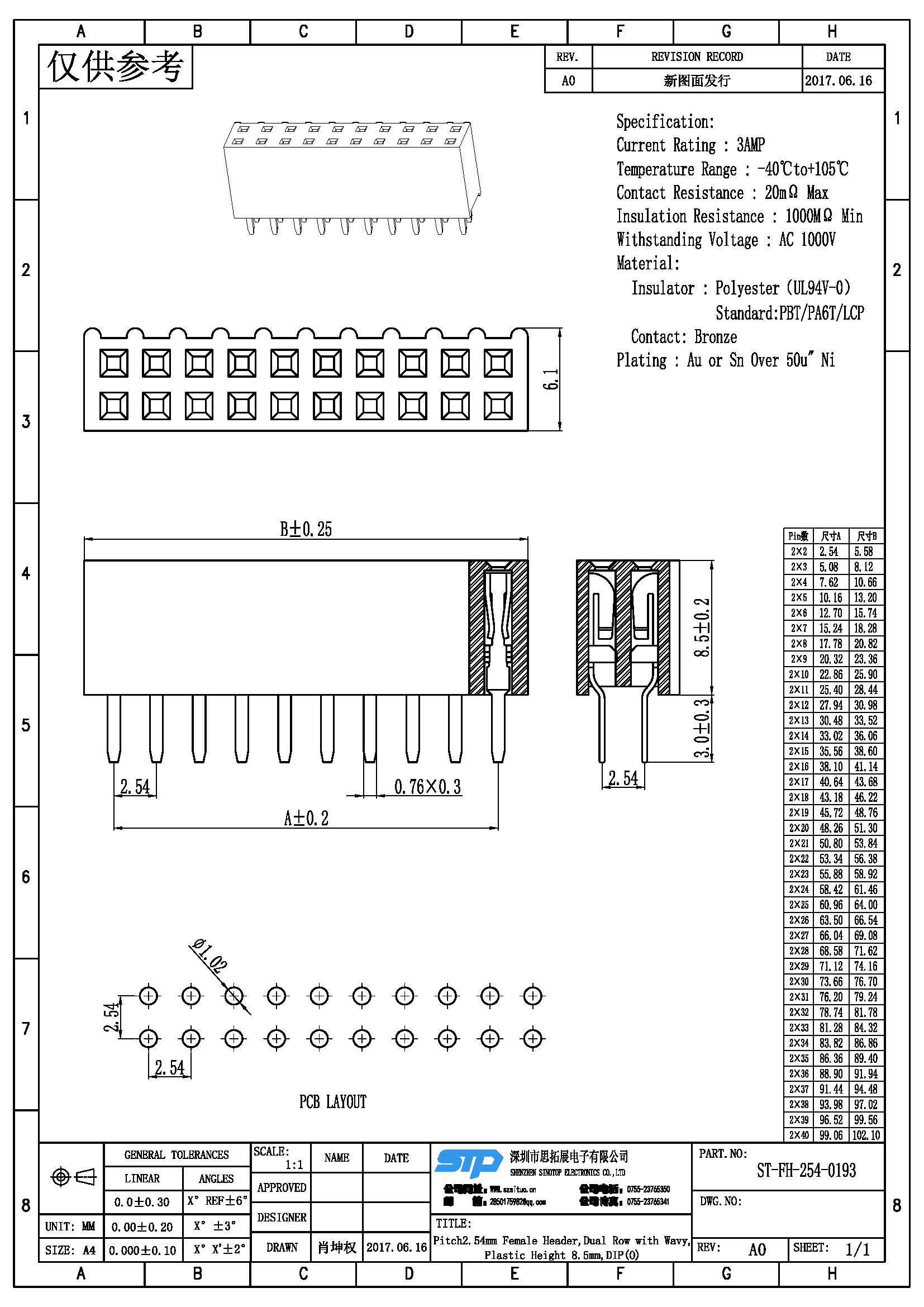 Spec:Pitch2.54MM Female Header,Dual Row, DIP Type (O)
