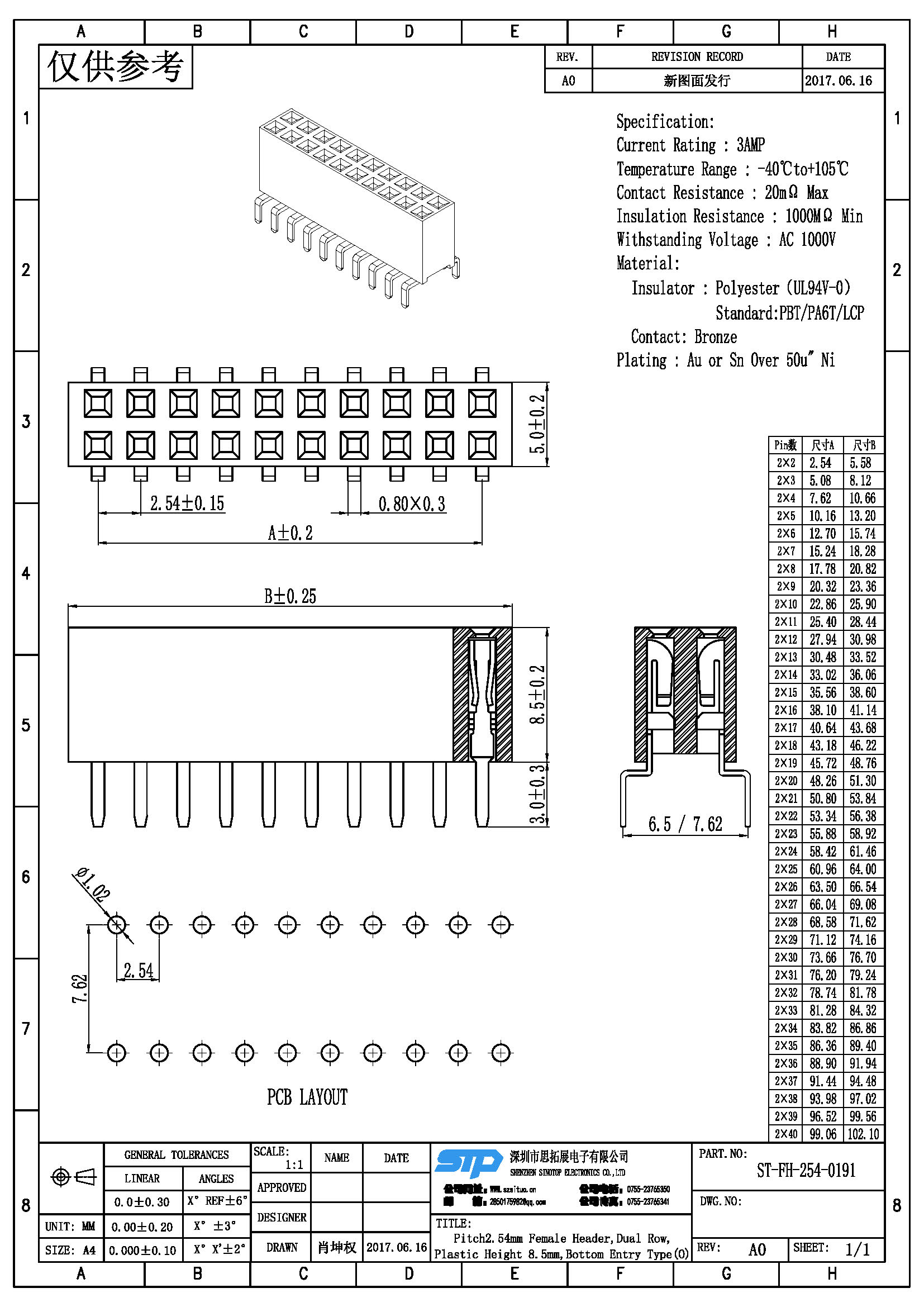 Spec:Pitch2.54MM Female Header,Dual Row, Bottom Entry Type (O)