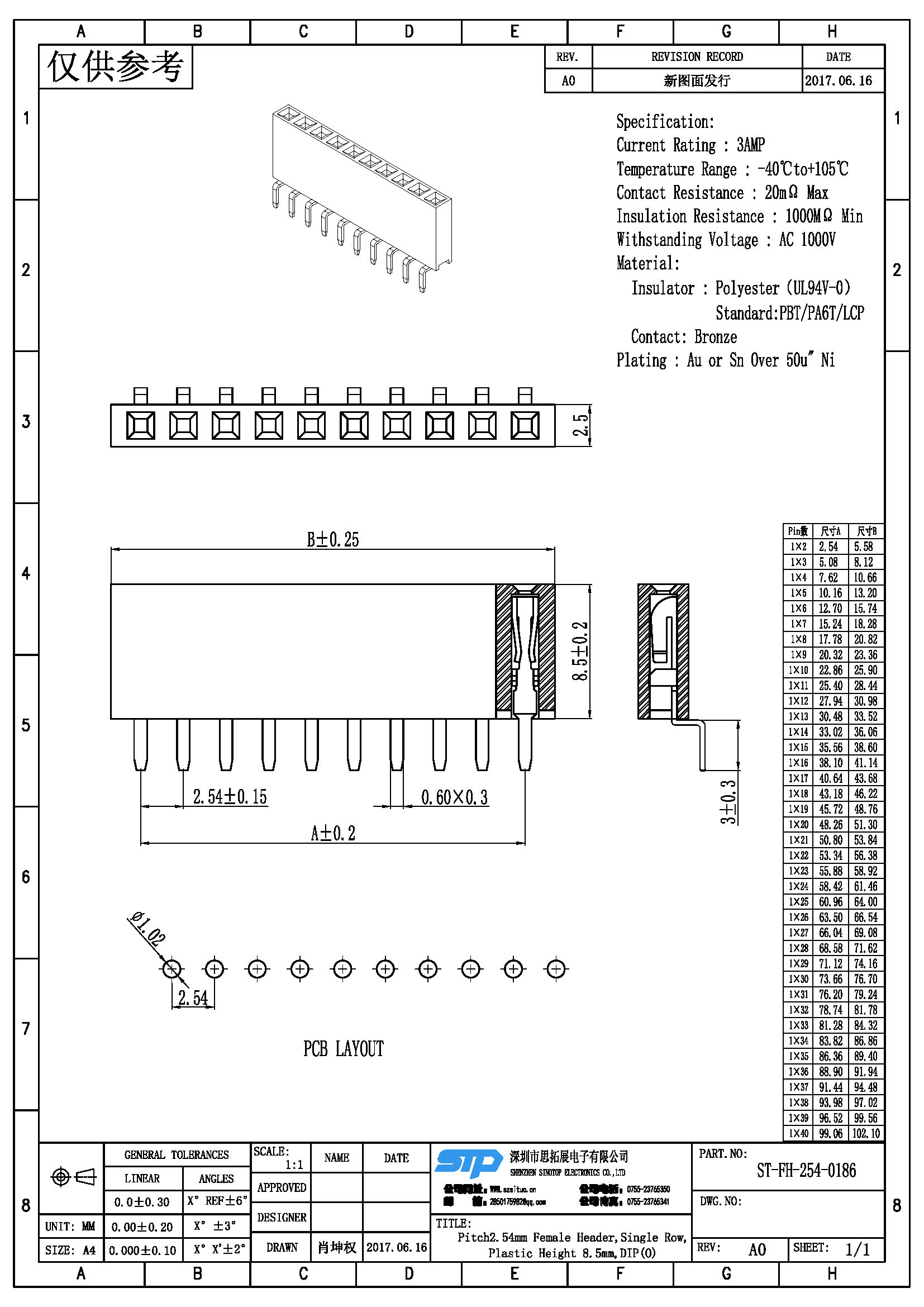 Spec:Pitch2.54MM Female Header,Single Row, DIP Type (O)