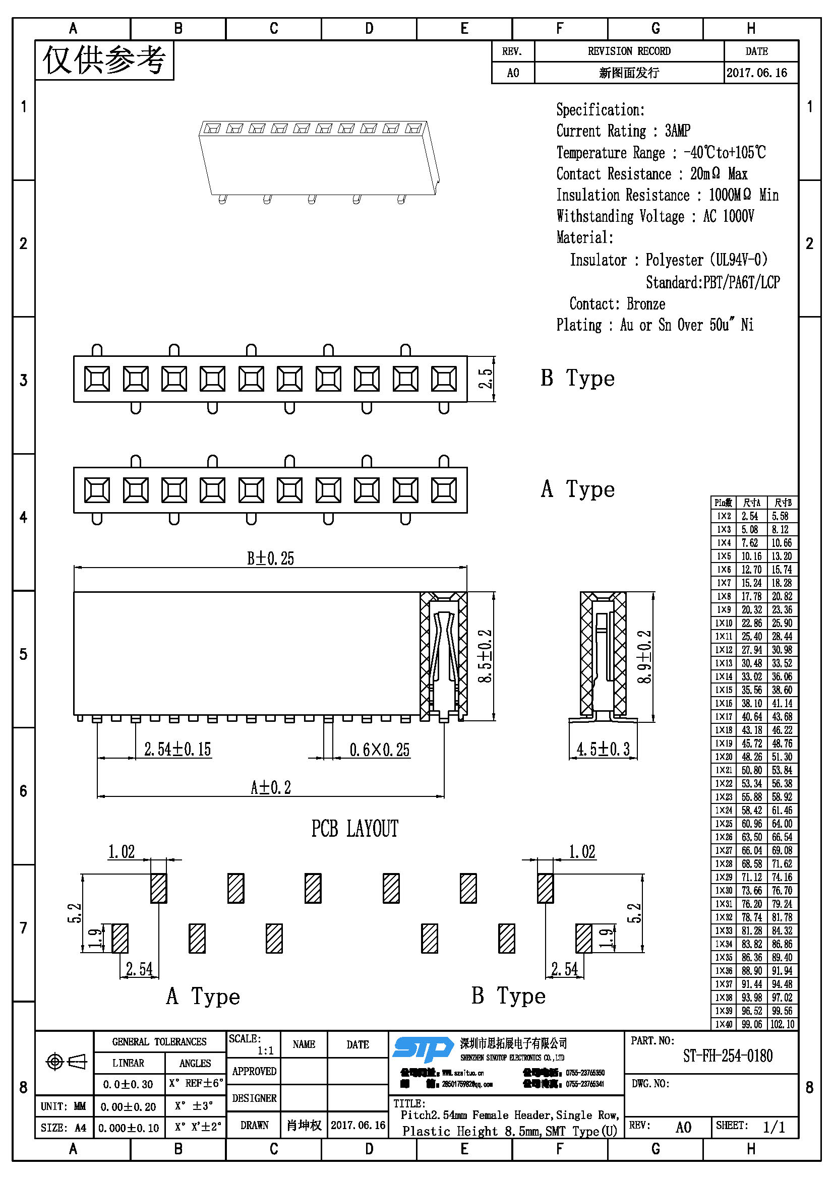 规格型号:Pitch2.54MM,单排母,错位贴 U端