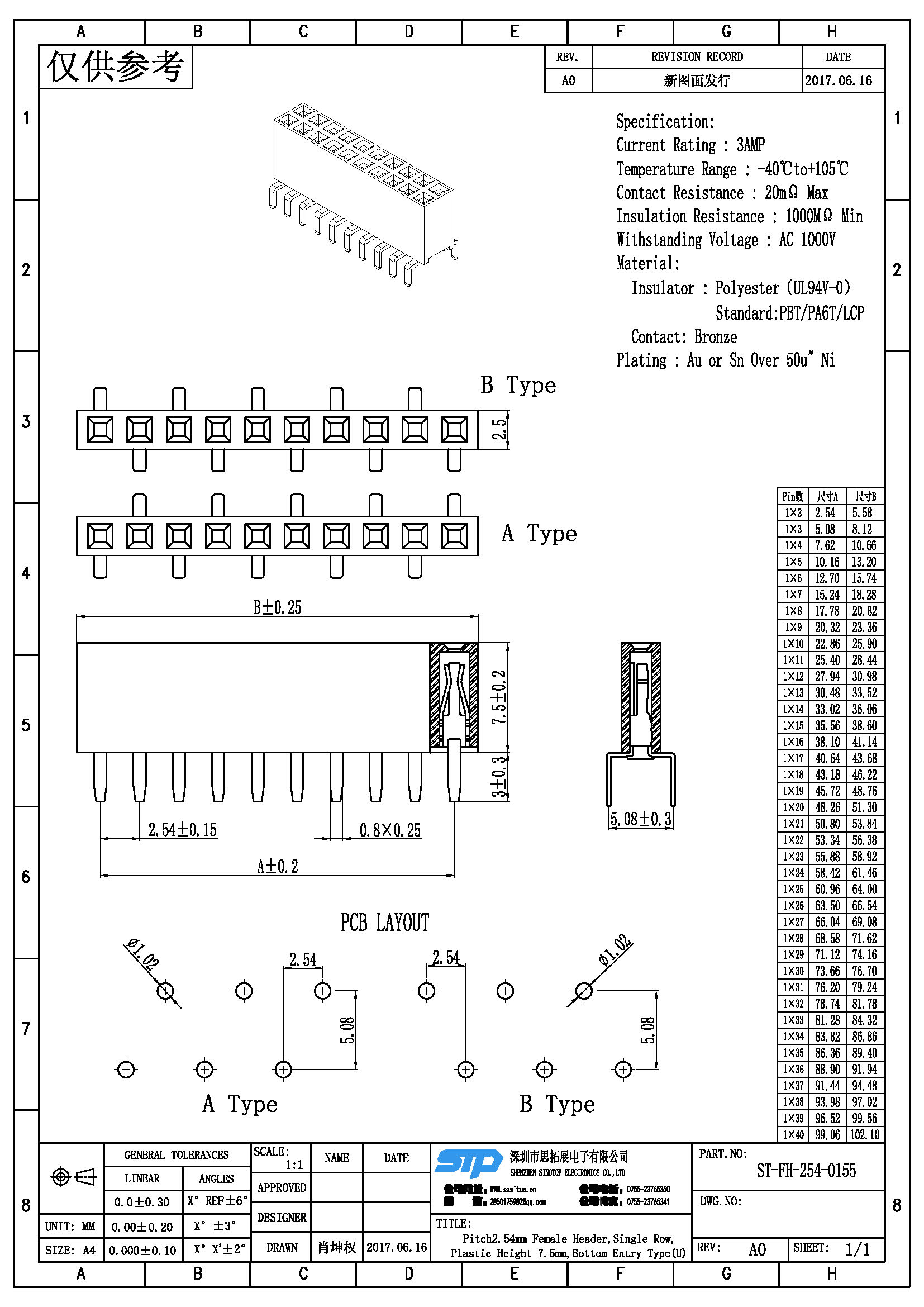 Spec:Pitch2.54MM Female Header,Single Row, Bottom Entry Type (U)