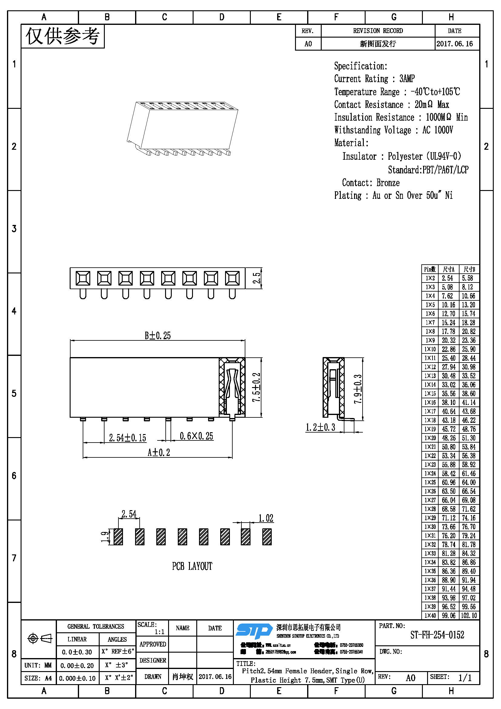 - 产品规格:2.54MM单排母,SMT,U型端子