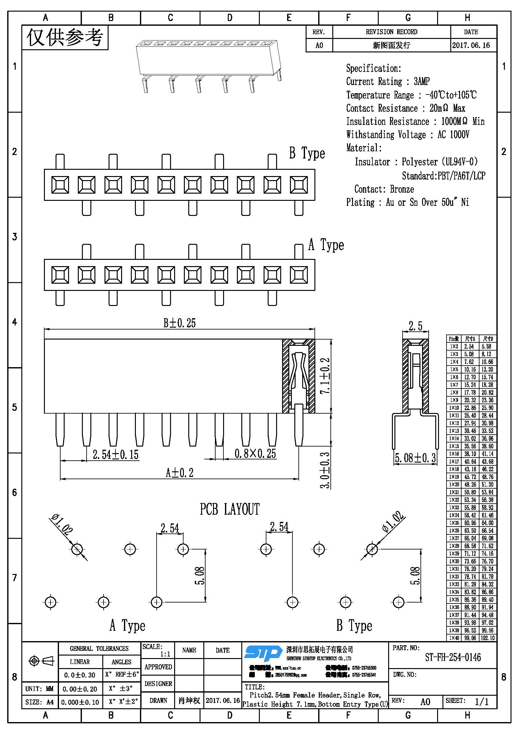 Spec:Pitch2.54MM Female Header,Single Row, Bottom Entry Type (U)