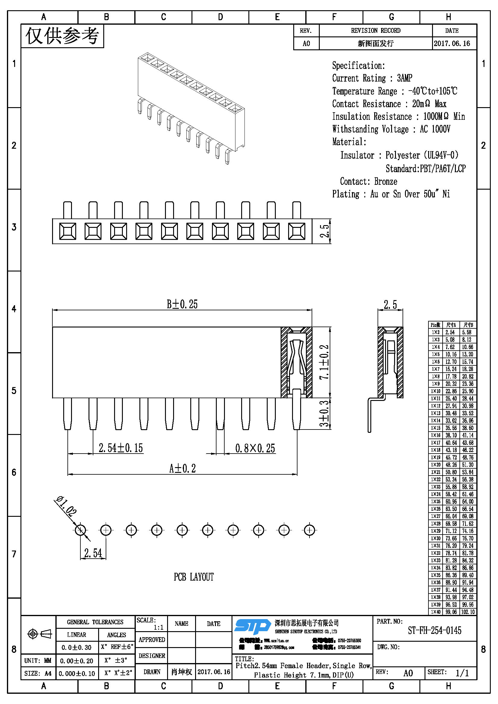 Spec:Pitch2.54MM Female Header,Single Row, Bottom Entry DIP Type (U)