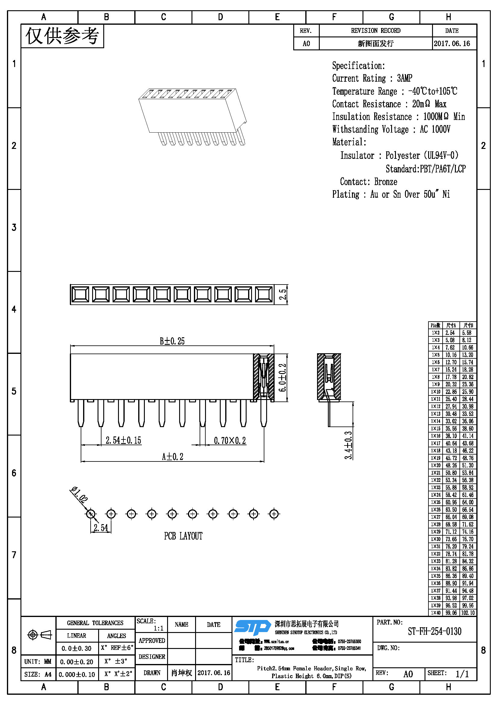 规格型号:Pitch2.54MM,单排母,DIP 四面包