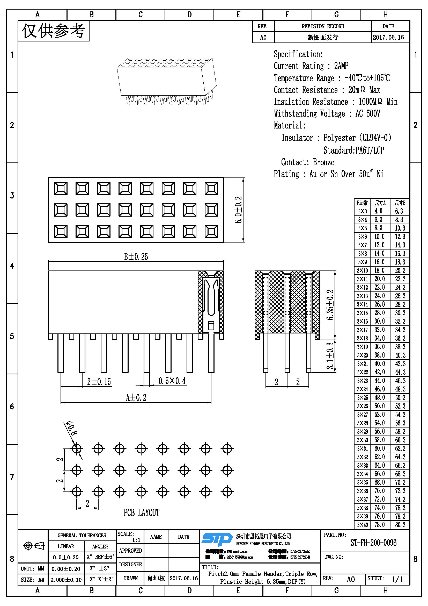 规格型号:Pitch2.00MM,三排母,DIP Y端