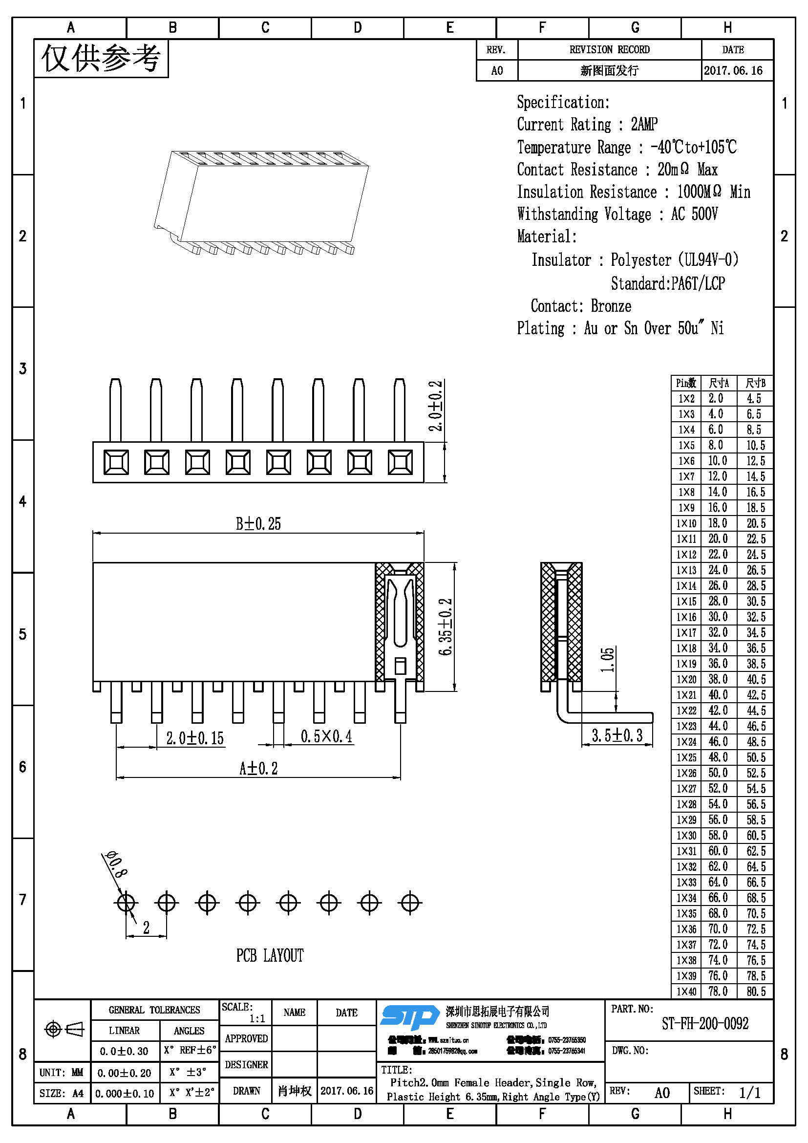 Spec:Pitch2.00MM Female Header,Single Row , Right Angle Type (Y)