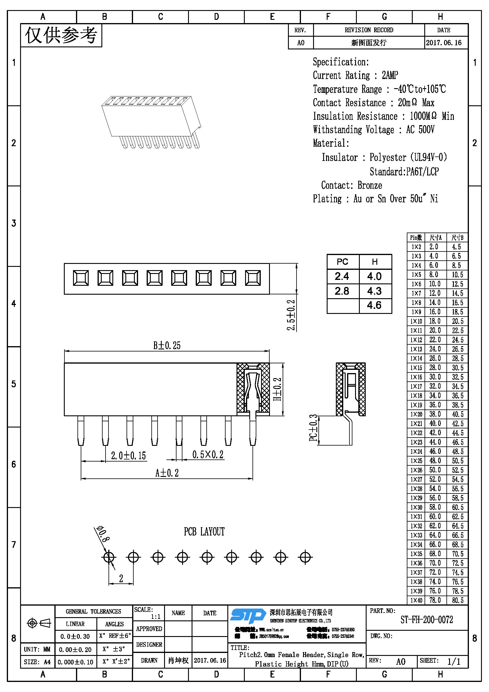 规格型号:Pitch2.00MM,单排母,DIP U端