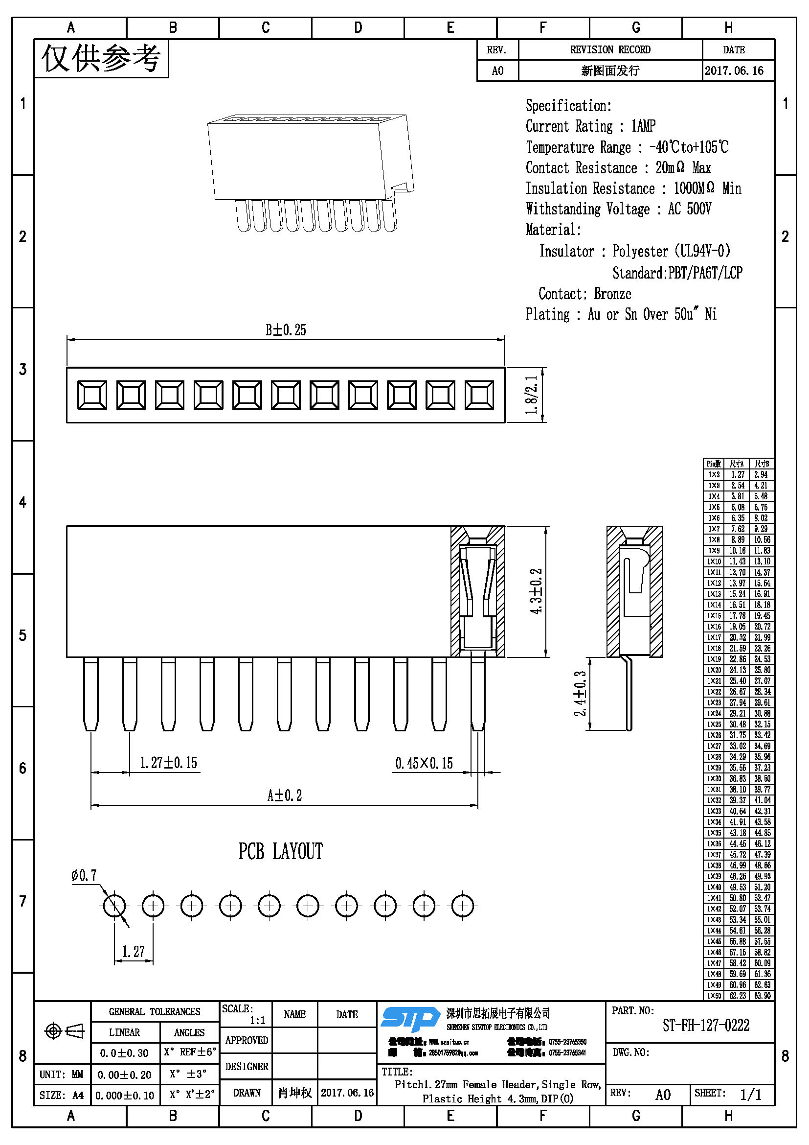 Spec:Pitch1.27MM Female Header,Single Row, DIP Type (O)