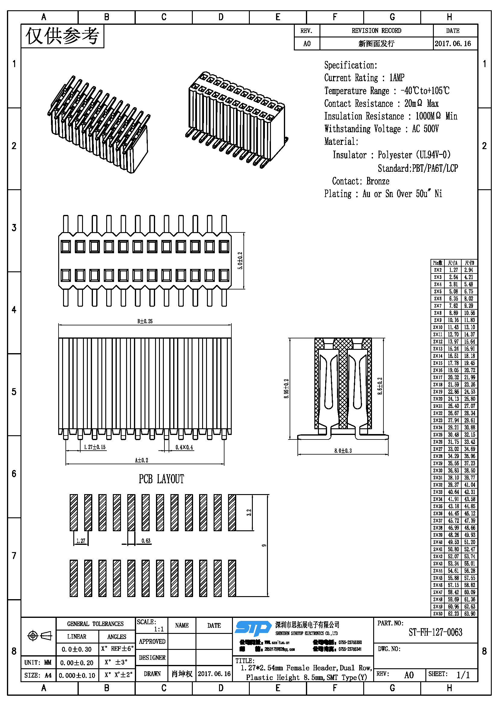 - 产品规格:1.27*2.54MM双排母,SMT,Y型端子
