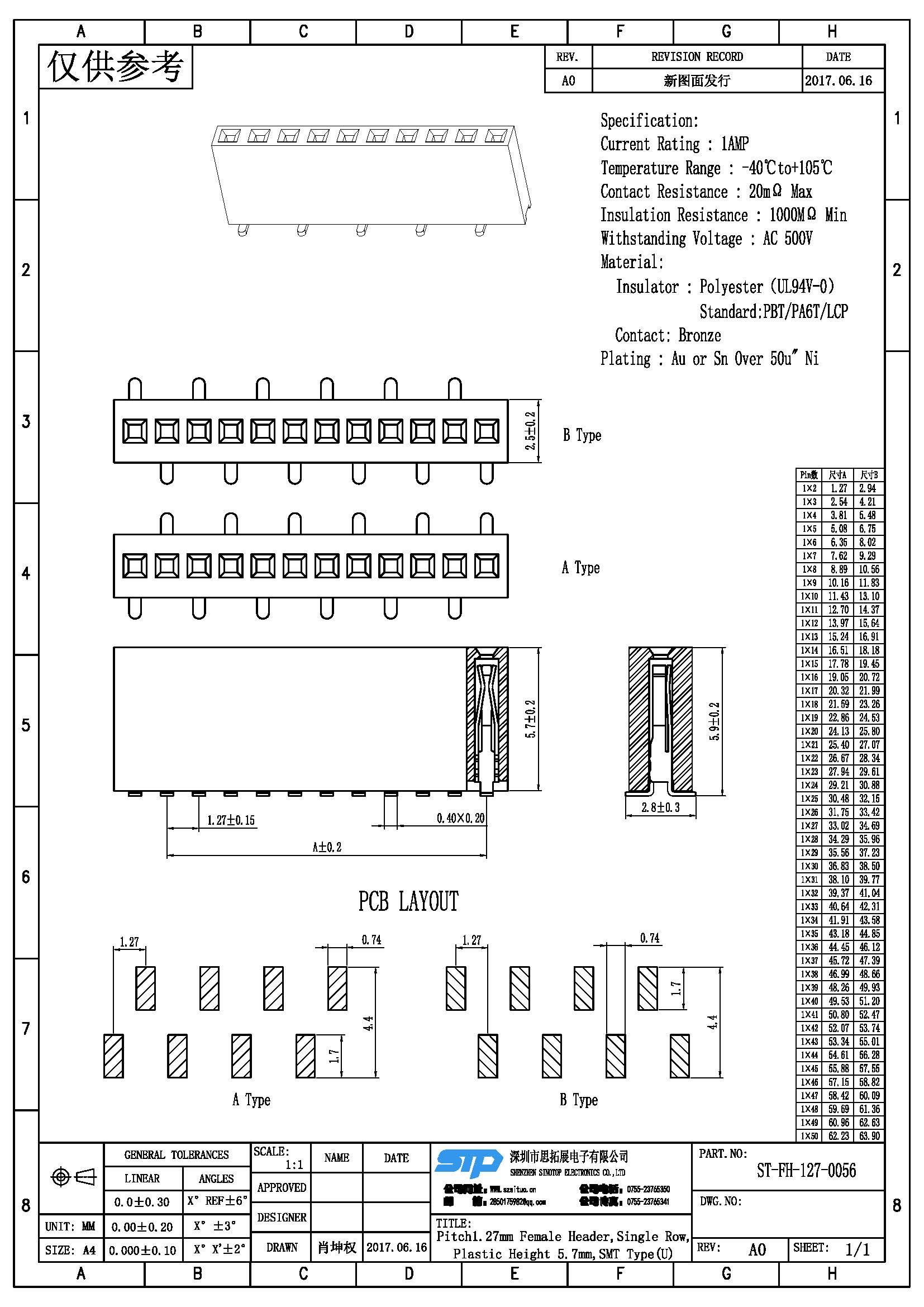 - 产品规格:1.27MM单排母,SMT,U型端子