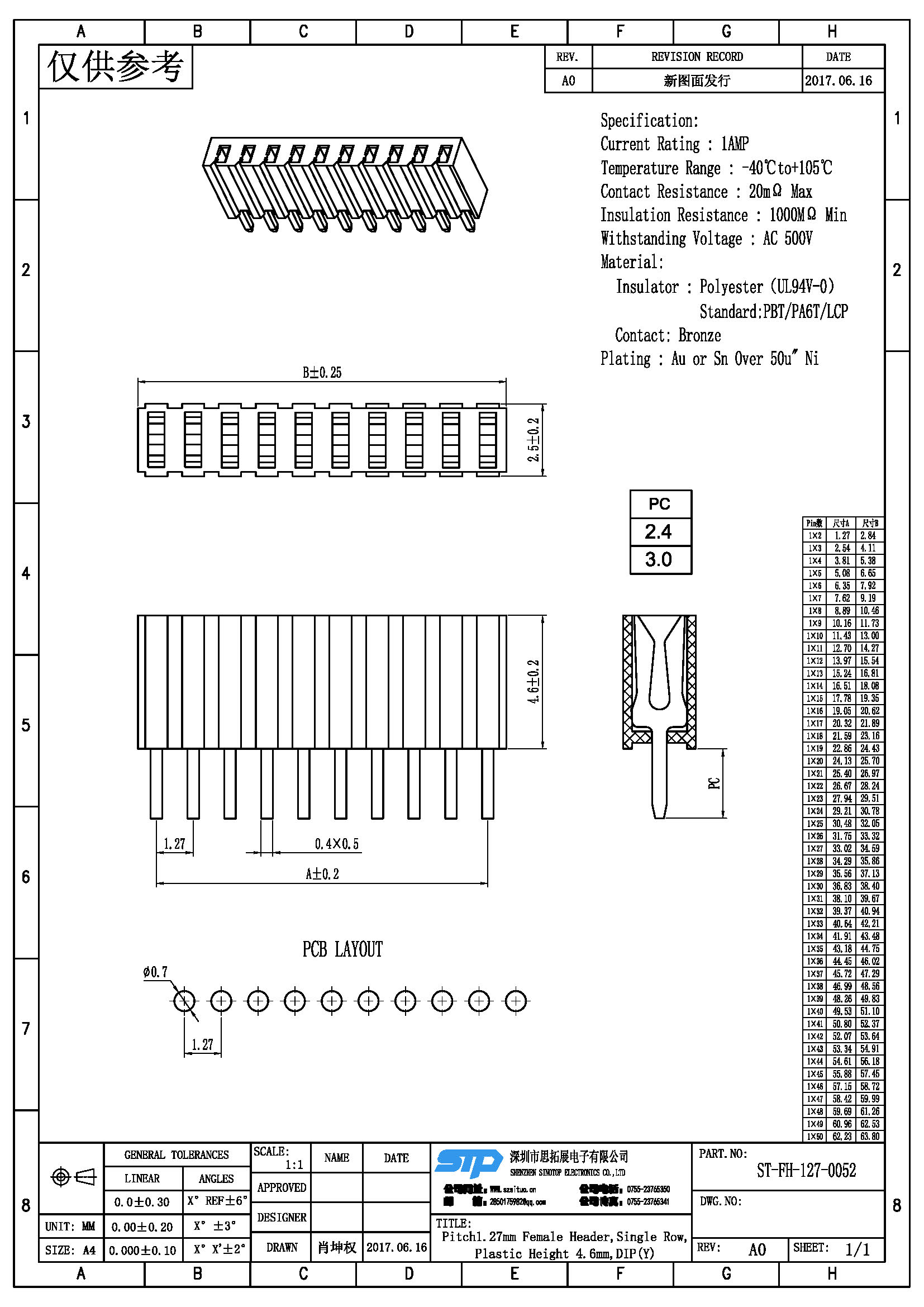 Spec:Pitch1.27MM Female Header,Single Row, DIP Type (Y)