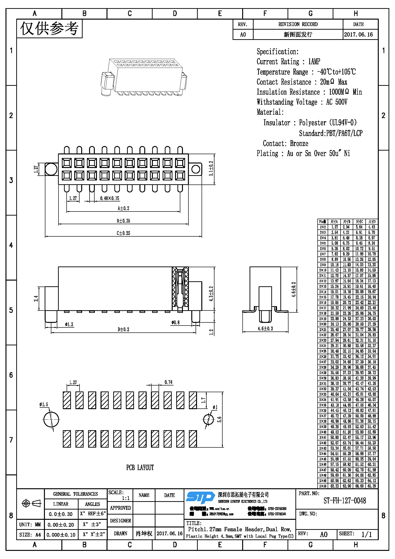 - 产品规格:1.27MM双排母,SMT,U端带外柱