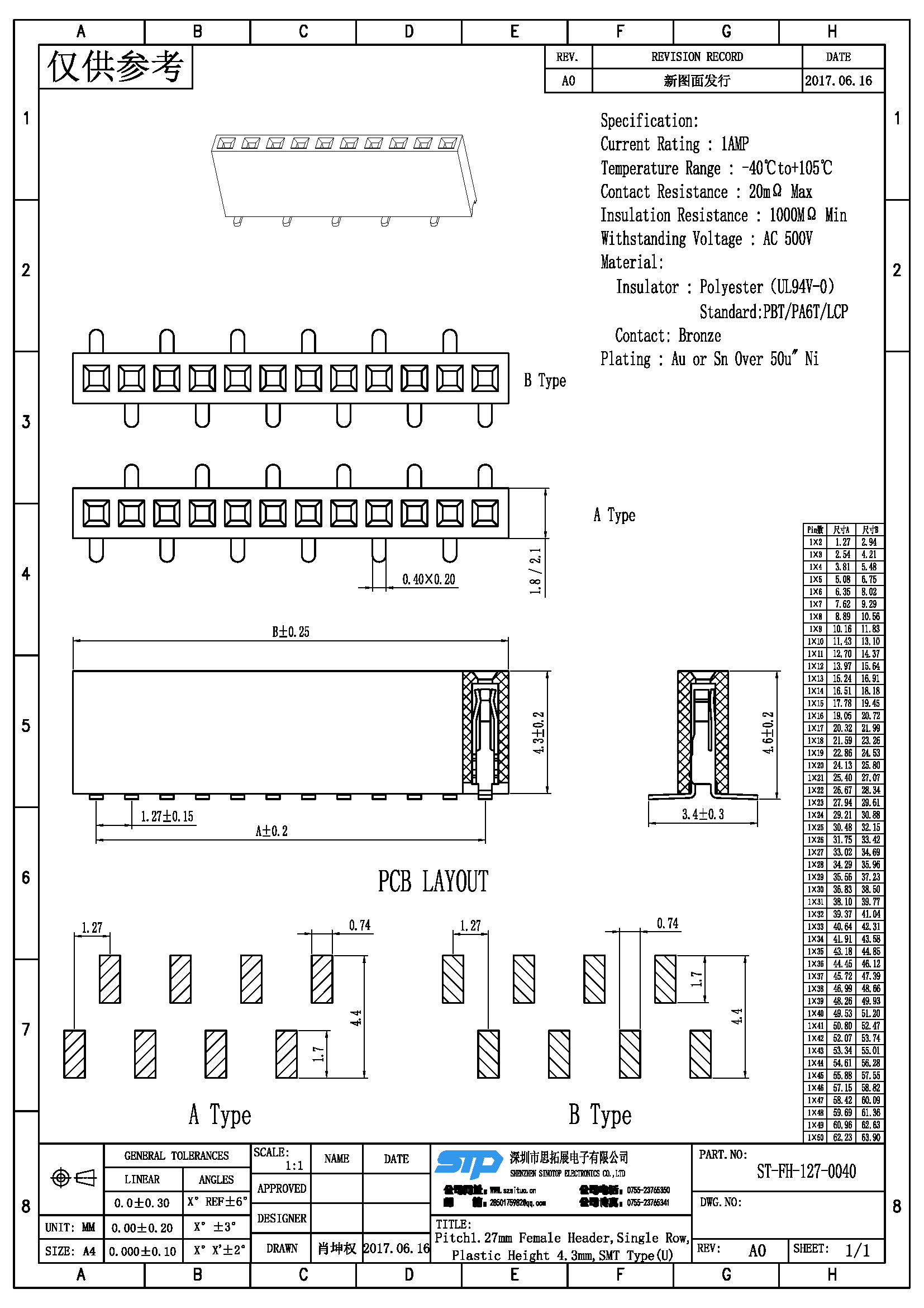 Spec:Pitch1.27MM Female Header,Single Row, SMT Type (U)