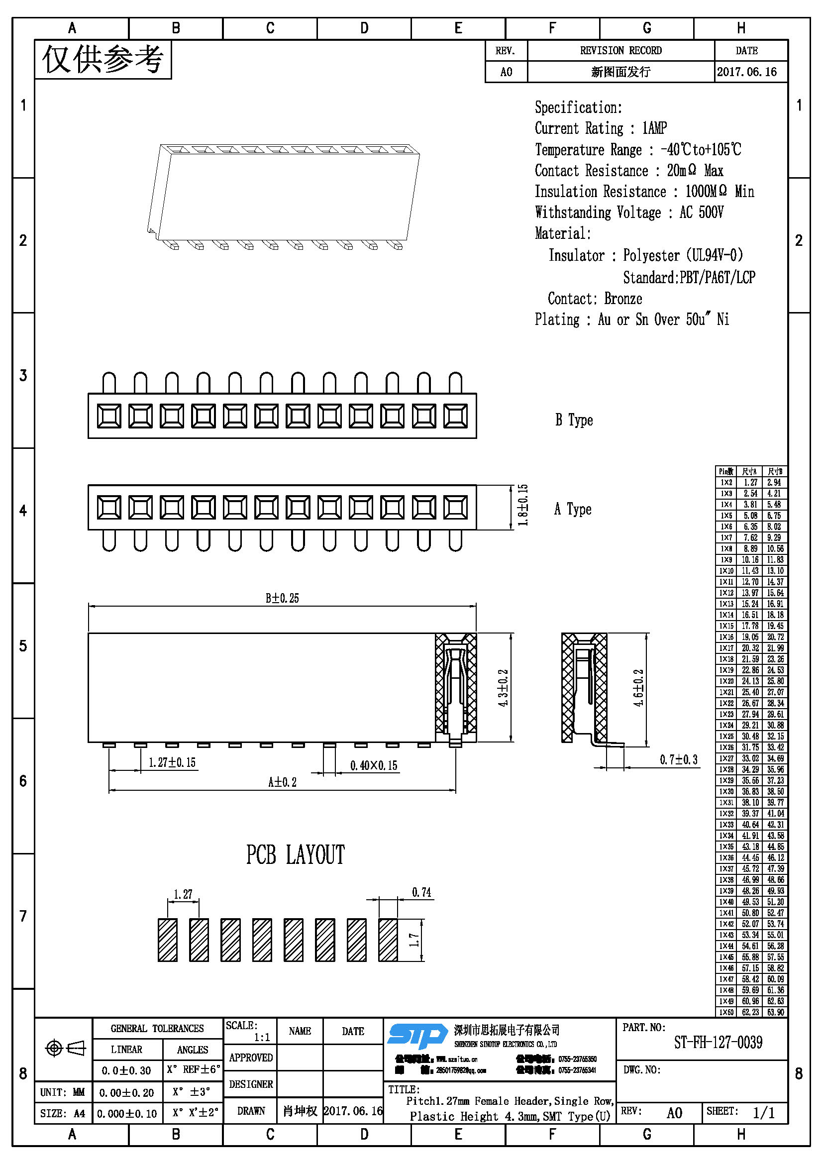 - 产品规格:1.27MM单排母,SMT,U型端子