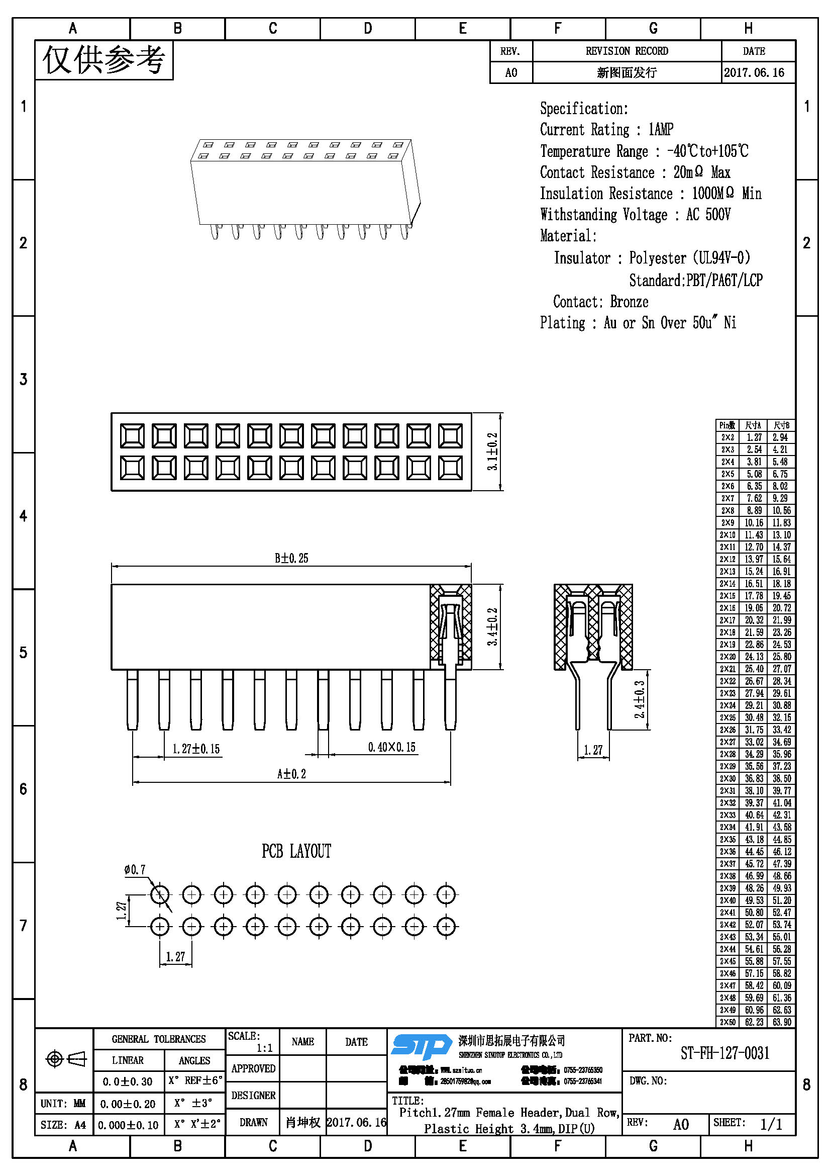 Spec:Pitch1.27MM Female Header,Dual Row, DIP Type (U)
