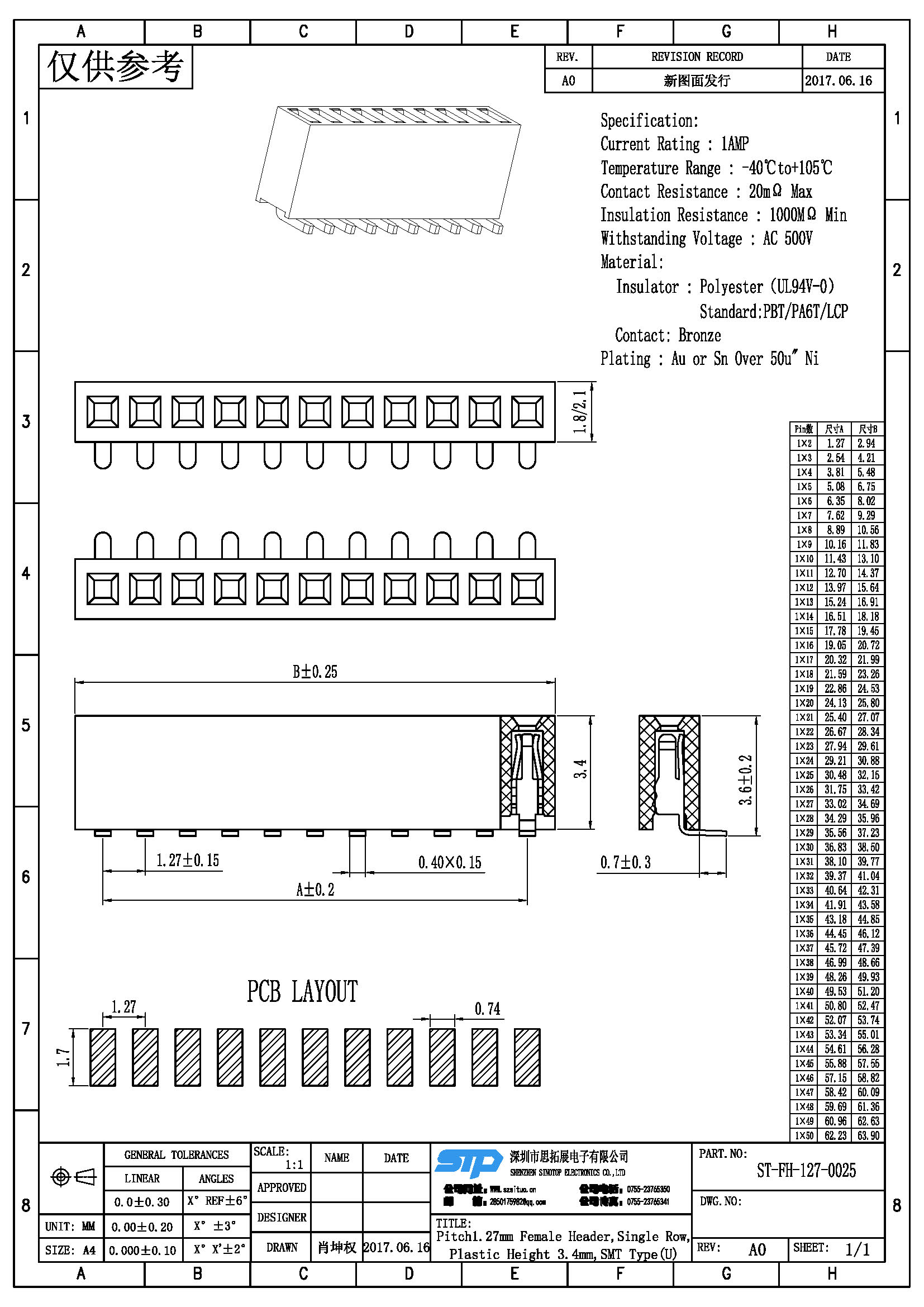 - 产品规格:1.27MM单排母,SMT,U型端子