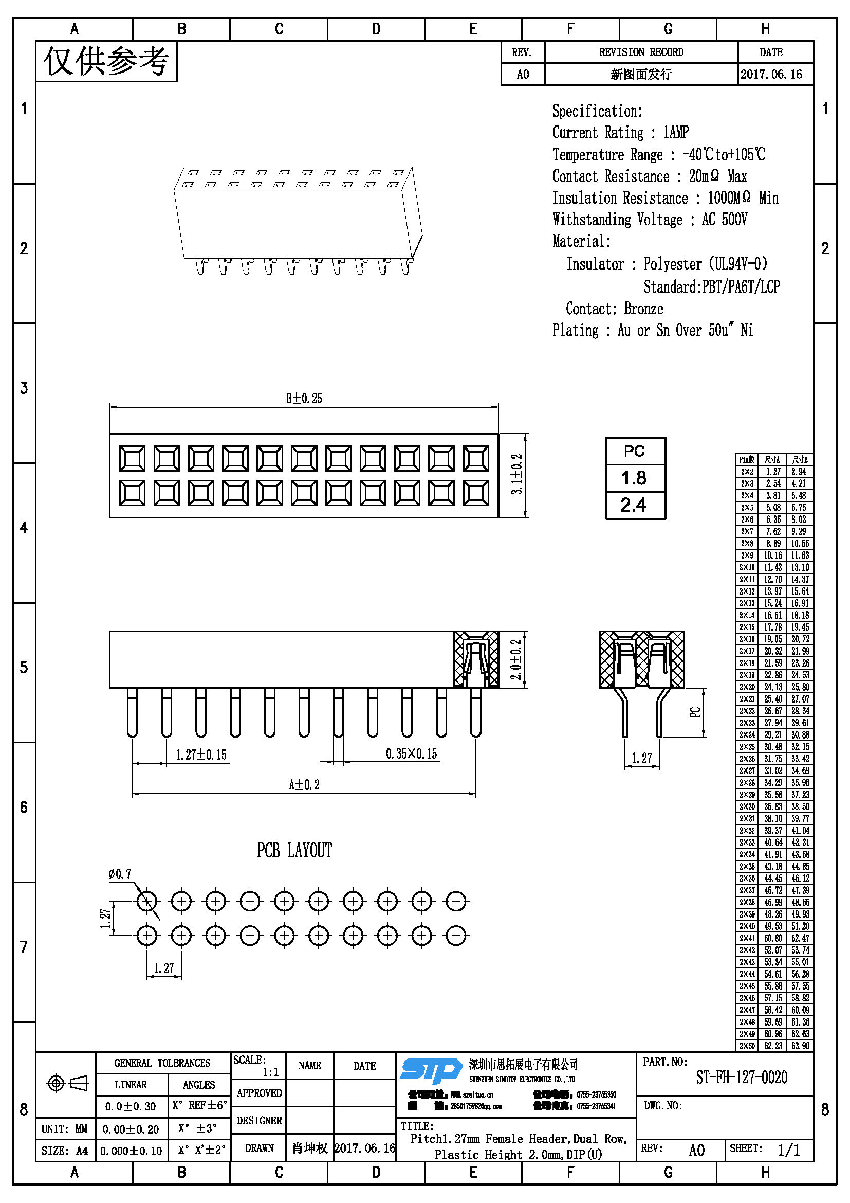 Spec:Pitch1.27MM Female Header,Dual Row, DIP Type (U)