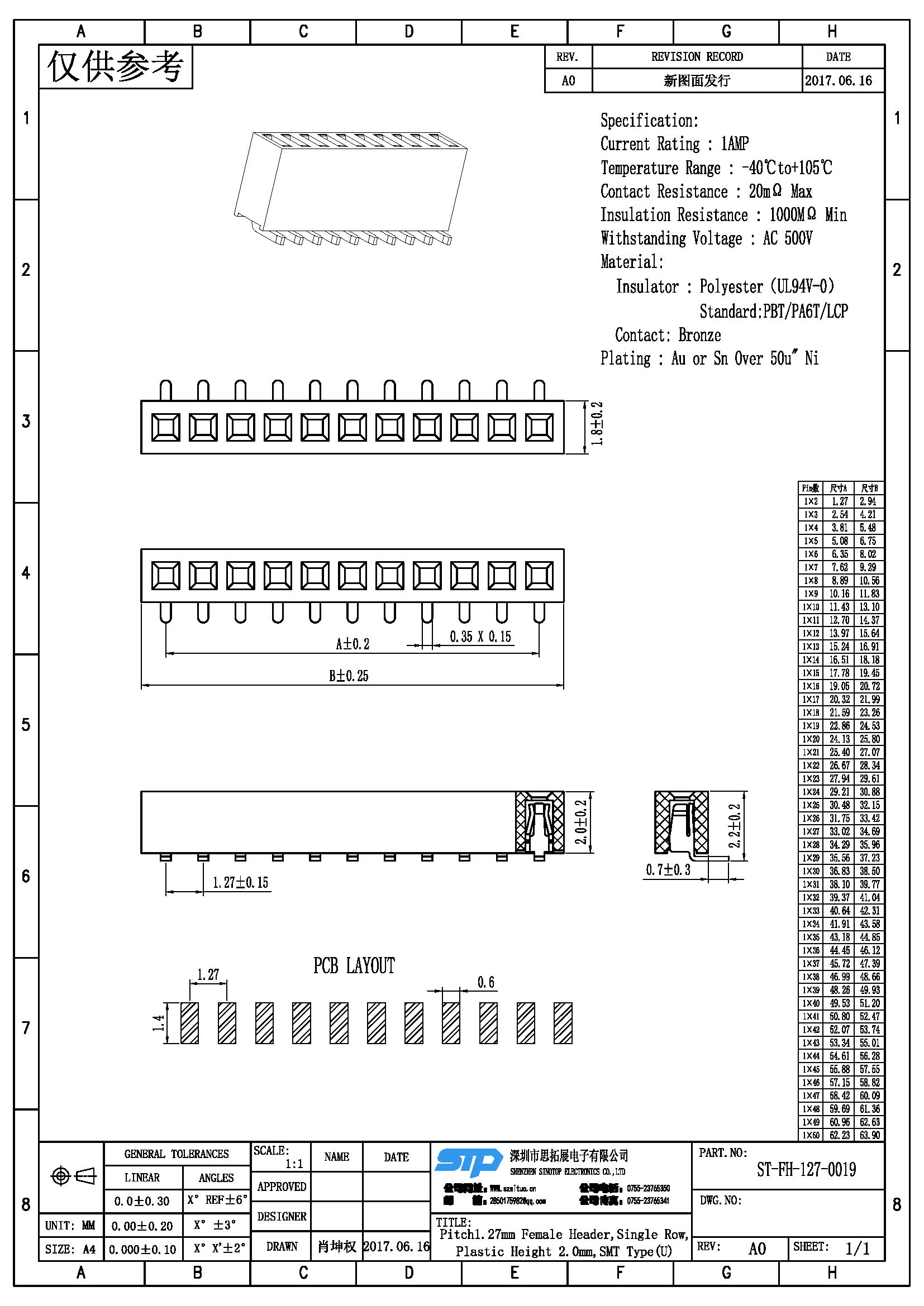 - 产品规格:1.27MM单排母,SMT,U型端子