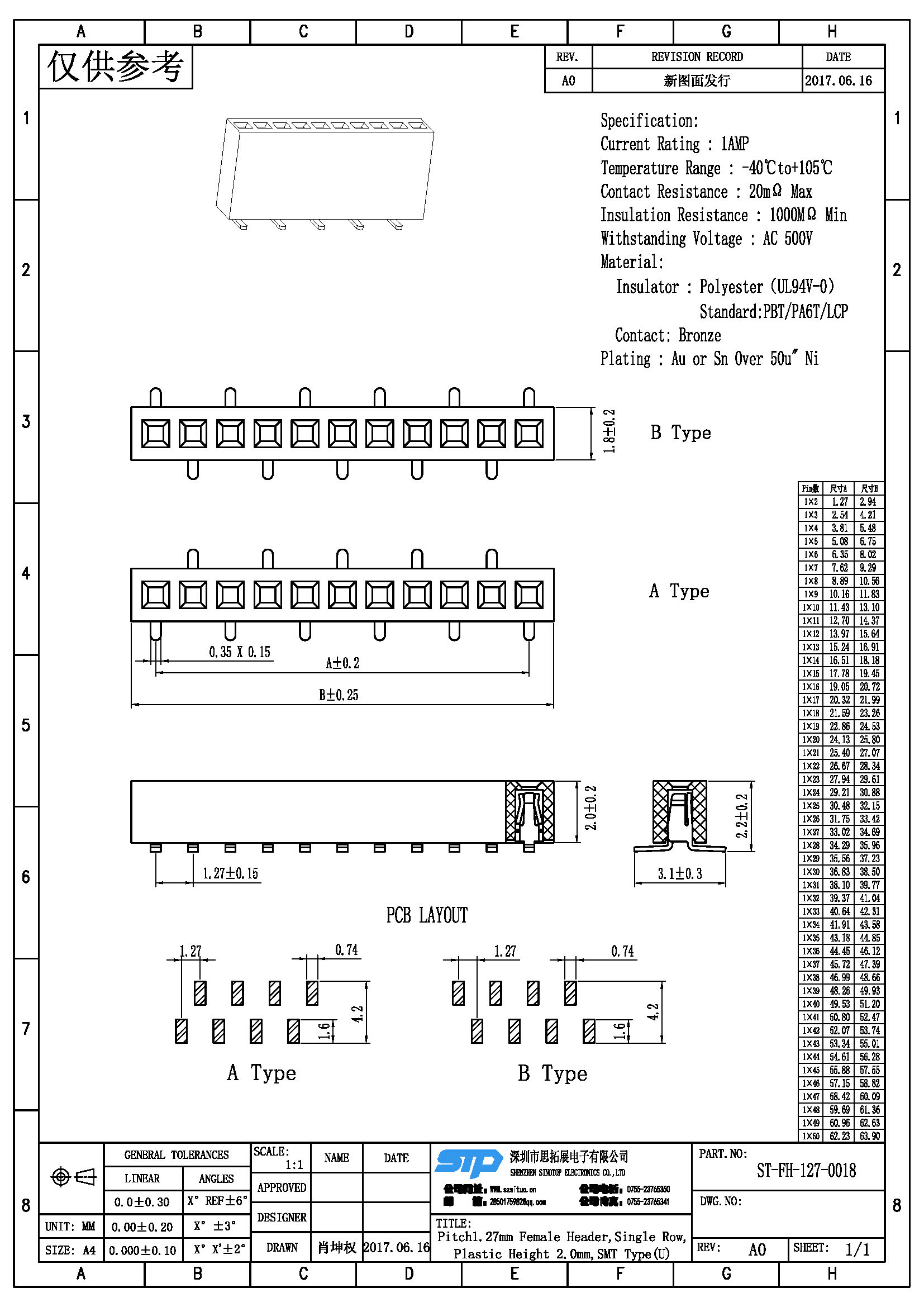 Spec:Pitch1.27MM Female Header,Single Row, SMT Type (U)