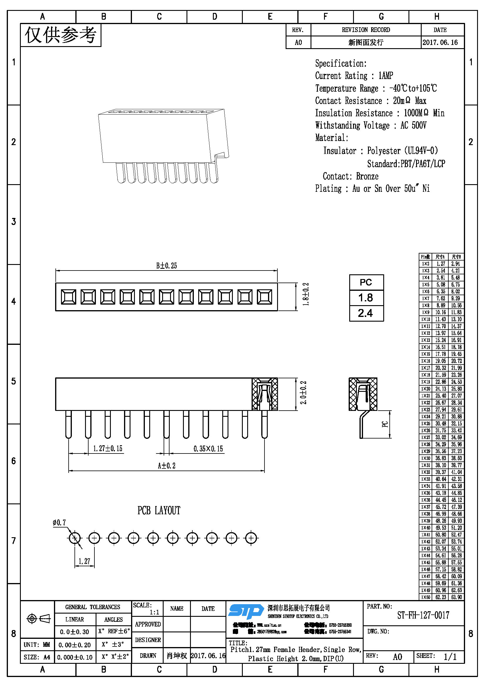 Spec:Pitch1.27MM Female Header,Single Row, DIP Type (U)