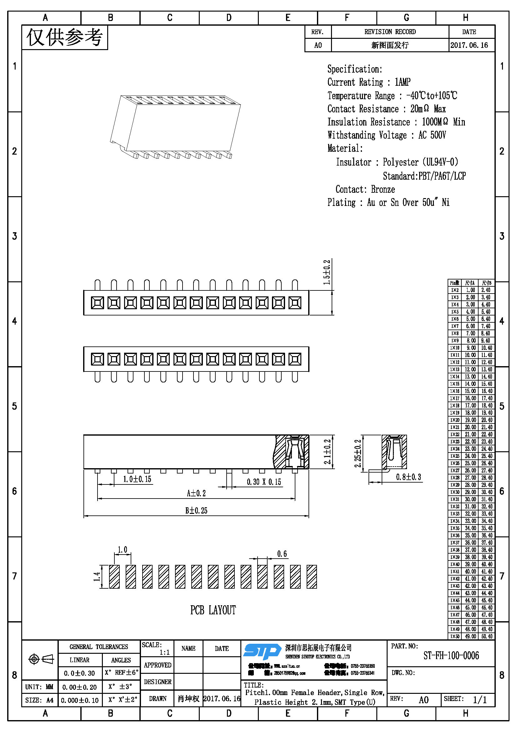 - 产品规格:1.0MM单排母,SMT,U型端子