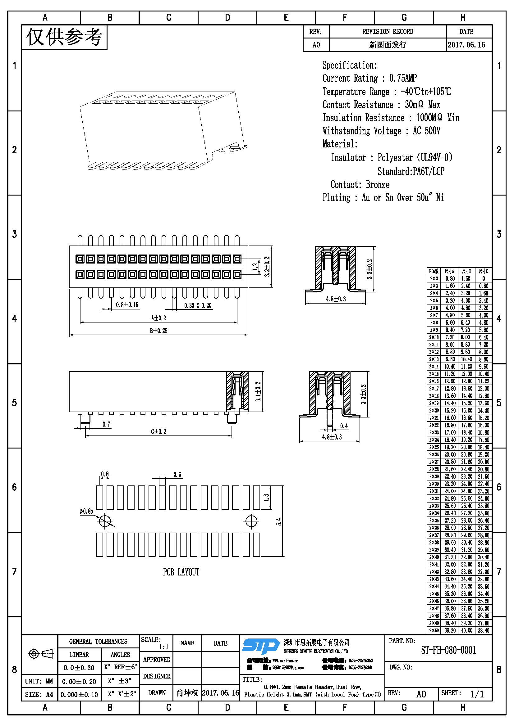 - 产品规格:0.8*1.2MM双排母,SMT,U型端子