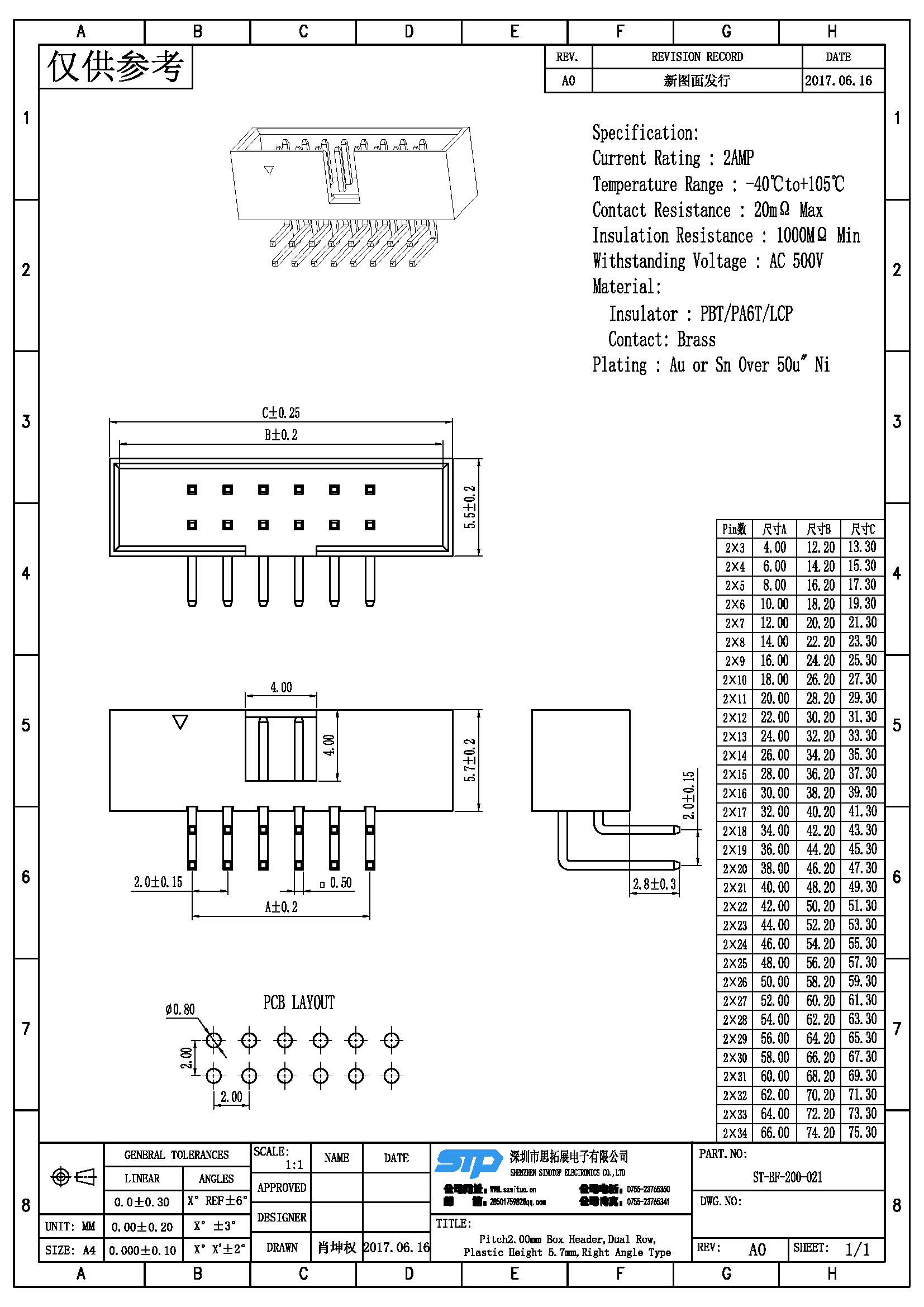 间距:PITCH2.00MM简易牛角,双排,90°, H5.7MM