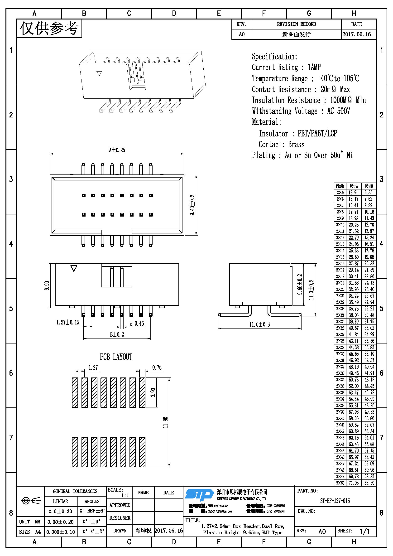 Pitch:1.27MM*2.54MM
